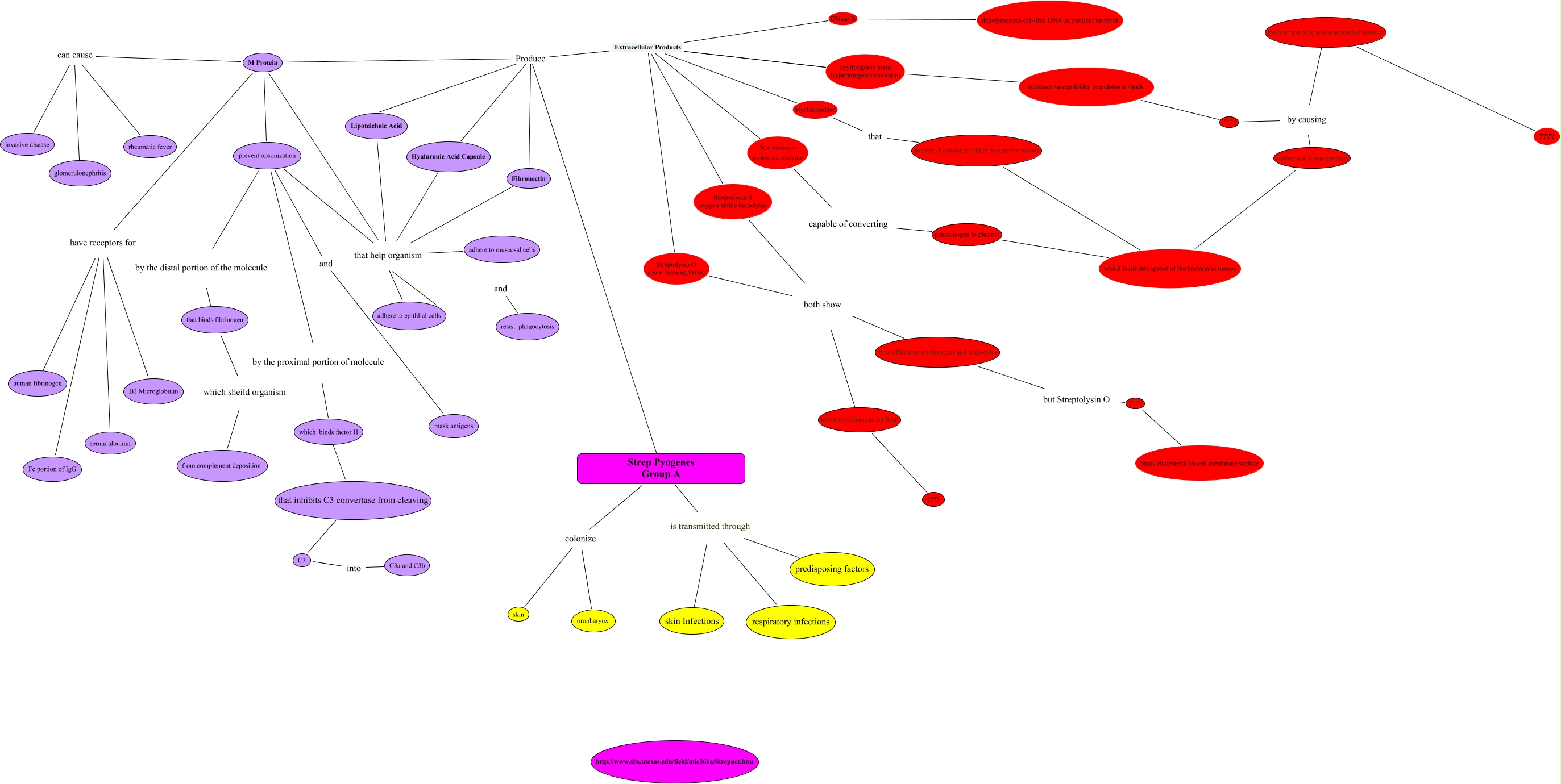 This Concept Map, created with IHMC CmapTools, has information related to: Stertococus new, both show hemolysis observed on BAP ????, both show lytic effects on erythrocytes and leukocytes but Streptolysin O, Extracellular Products Erythrogenic toxin (superantigenic exotoxin) increases susceptibility to endotoxic shock, serum albumin have receptors for human fibrinogen, Strep Pyogenes Group A is transmitted through respiratory infections, Extracellular Products Streptolysin O (pore-forming toxin) both show, adhere to epithlial cells that help organism M Protein, Strep Pyogenes Group A is transmitted through skin Infections, by causing cardiac and tissue necrosis which facilitates spread of the bacteria in tissues, adhere to muscosal cells and resist phagocytosis, Extracellular Products DNase B depolymerizes cell-free DNA in purulent material, Strep Pyogenes Group A colonize skin, prevent opsonization that help organism Fibronectin, Extracellular Products Erythrogenic toxin (superantigenic exotoxin) increases susceptibility to endotoxic shock, C3 that inhibits C3 convertase from cleaving which binds factor H, Hyaluronic Acid Capsule that help organism adhere to muscosal cells, prevent opsonization that help organism adhere to muscosal cells, prevent opsonization by the proximal portion of molecule which binds factor H, prevent opsonization that help organism M Protein, adhere to epithlial cells that help organism Fibronectin