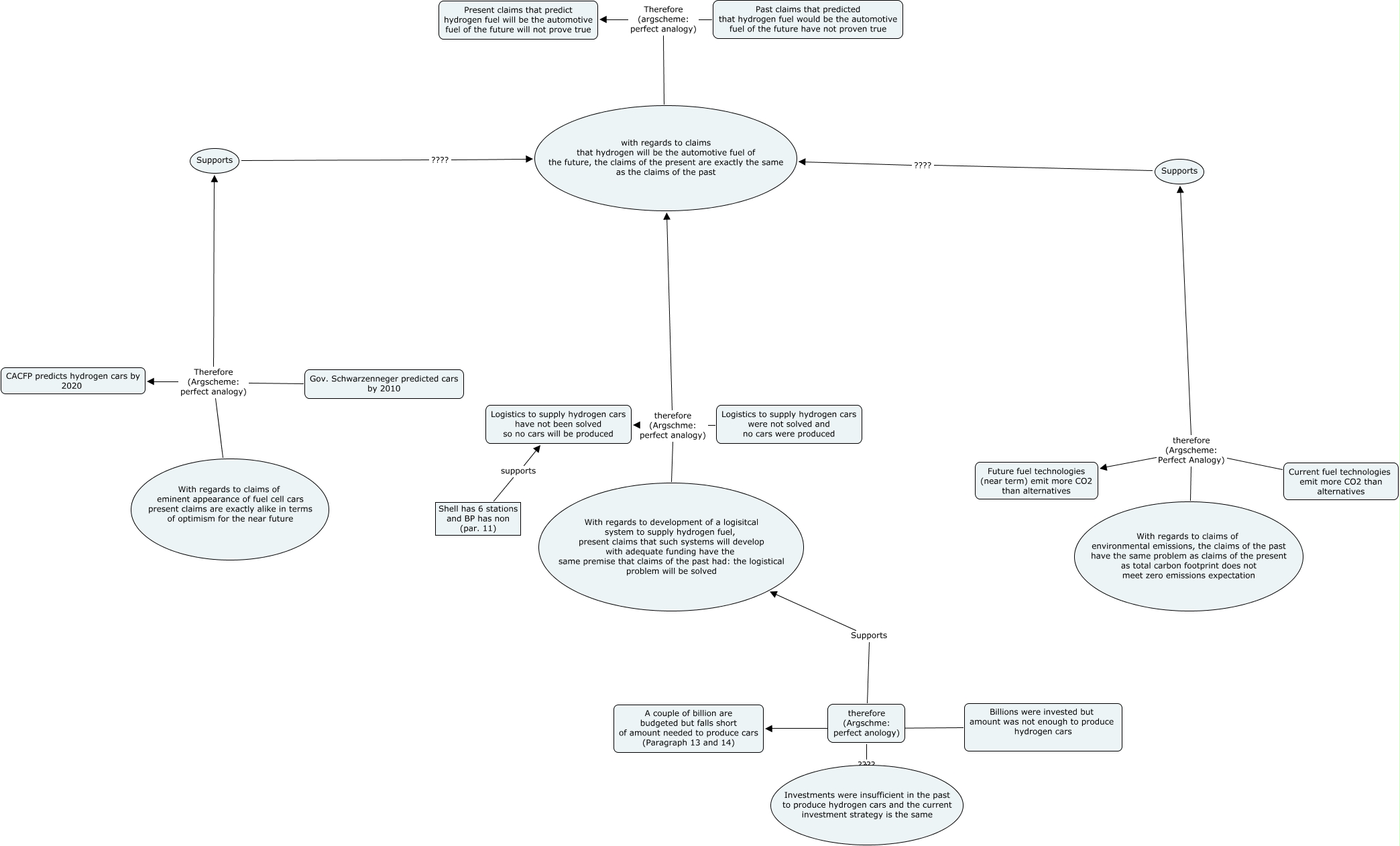 This Concept Map, created with IHMC CmapTools, has information related to: Hydrogen Flowers map2, Gov. Schwarzenneger predicted cars by 2010 Therefore (Argscheme: perfect analogy) With regards to claims of eminent appearance of fuel cell cars present claims are exactly alike in terms of optimism for the near future, Past claims that predicted that hydrogen fuel would be the automotive fuel of the future have not proven true Therefore (argscheme: perfect analogy) Present claims that predict hydrogen fuel will be the automotive fuel of the future will not prove true, Past claims that predicted that hydrogen fuel would be the automotive fuel of the future have not proven true Therefore (argscheme: perfect analogy) with regards to claims that hydrogen will be the automotive fuel of the future, the claims of the present are exactly the same as the claims of the past, Logistics to supply hydrogen cars were not solved and no cars were produced therefore (Argschme: perfect analogy) with regards to claims that hydrogen will be the automotive fuel of the future, the claims of the present are exactly the same as the claims of the past, therefore (Argschme: perfect anology) Supports With regards to development of a logisitcal system to supply hydrogen fuel, present claims that such systems will develop with adequate funding have the same premise that claims of the past had: the logistical problem will be solved, Gov. Schwarzenneger predicted cars by 2010 Therefore (Argscheme: perfect analogy) CACFP predicts hydrogen cars by 2020, Current fuel technologies emit more CO2 than alternatives therefore (Argscheme: Perfect Analogy) Future fuel technologies (near term) emit more CO2 than alternatives, Current fuel technologies emit more CO2 than alternatives therefore (Argscheme: Perfect Analogy) Supports, Billions were invested but amount was not enough to produce hydrogen cars ???? A couple of billion are budgeted but falls short of amount needed to produce cars (Paragraph 13 and 14), therefore (Argschme: perfect anology) ???? Investments were insufficient in the past to produce hydrogen cars and the current investment strategy is the same, Logistics to supply hydrogen cars were not solved and no cars were produced therefore (Argschme: perfect analogy) With regards to development of a logisitcal system to supply hydrogen fuel, present claims that such systems will develop with adequate funding have the same premise that claims of the past had: the logistical problem will be solved, Shell has 6 stations and BP has non (par. 11) supports Logistics to supply hydrogen cars have not been solved so no cars will be produced, Supports ???? with regards to claims that hydrogen will be the automotive fuel of the future, the claims of the present are exactly the same as the claims of the past, Supports ???? with regards to claims that hydrogen will be the automotive fuel of the future, the claims of the present are exactly the same as the claims of the past, Gov. Schwarzenneger predicted cars by 2010 Therefore (Argscheme: perfect analogy) Supports, Current fuel technologies emit more CO2 than alternatives therefore (Argscheme: Perfect Analogy) With regards to claims of environmental emissions, the claims of the past have the same problem as claims of the present as total carbon footprint does not meet zero emissions expectation, Logistics to supply hydrogen cars were not solved and no cars were produced therefore (Argschme: perfect analogy) Logistics to supply hydrogen cars have not been solved so no cars will be produced