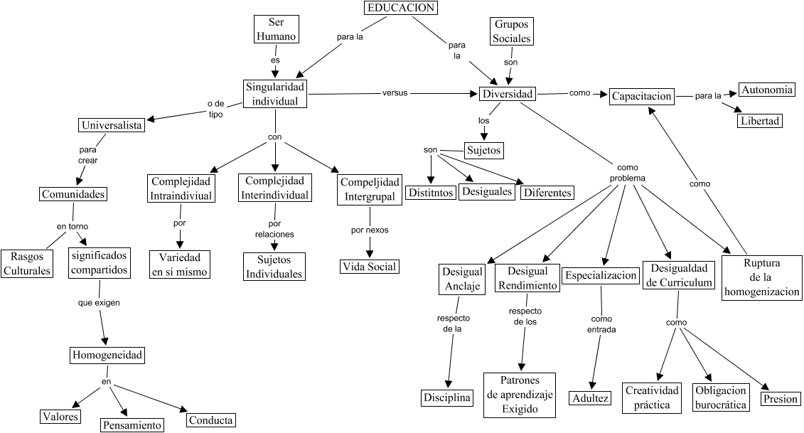 Este Cmap, tiene información relacionada con: GABY (I), significados compartidos que exigen Homogeneidad, Singularidad individual con Complejidad Interindividual, Diversidad como problema Desigual Rendimiento, Desigualdad de Curriculum como Presion, Sujetos son Diferentes, Homogeneidad en Pensamiento, Ruptura de la homogenizacion como Capacitacion, Homogeneidad en Valores, Desigual Rendimiento respecto de los Patrones de aprendizaje Exigido, Diversidad como problema Especializacion, Singularidad individual o de tipo Universalista, Complejidad Intraindiviual por Variedad en si mismo, Singularidad individual con Compeljidad Intergrupal, Singularidad individual con Complejidad Intraindiviual, Rasgos Culturales en torno significados compartidos, Desigualdad de Curriculum como Obligacion burocrática, Homogeneidad en Conducta, Diversidad como problema Desigual Anclaje, Sujetos son Distitntos, Complejidad Interindividual por relaciones Sujetos Individuales
