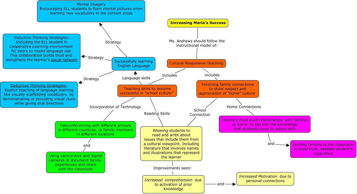 This Concept Map, created with IHMC CmapTools, has information related to: L. Johnson_Maria_4, Successfully learning English Language Strategy Mental Imagery Encouraging ELL students to form mental pictures when learning new vocabulary in the content areas, Allowing students to read and write about issues that include them from a cultural viewpoint. Including literature that involves names and illustrations that represent the learner Improvements seen: Increased comprehension due to activation of prior knowledge, Involving family connections to show respect and appreciation of "home" culture School Connection Allowing students to read and write about issues that include them from a cultural viewpoint. Including literature that involves names and illustrations that represent the learner, Cultural Responsive Teaching includes Teaching skills to become successful in "school culture", Successfully learning English Language Strategy Deductive Thinking Strategies: Explicit teaching of language learning like visually scaffolding vocabulary by demonstrating or providing visual clues while giving oral directions, Teaching skills to become successful in "school culture" Reading Skills Allowing students to read and write about issues that include them from a cultural viewpoint. Including literature that involves names and illustrations that represent the learner, Teleconferencing with different schools in different countries, or family members in different locations and Using camcorders and digital cameras to document family experiences and share with the classroom, Successfully learning English Language Strategy Inductive Thinking Strategies: Including the ELL student in Cooperative Learning environment for peers to model language use. This collaboration builds trust and stengthens the learner's social network, Teachers must build relationships with families at home, to tap into the knowledge that students come to school with and Inviting families to the classroom to build trust, validate student's experience, Increasing Maria's Success Ms. Andrews should follow the instructional model of: Cultural Responsive Teaching, Increased comprehension due to activation of prior knowledge and Increased Motivation due to personal connections, Involving family connections to show respect and appreciation of "home" culture Home Connections Teachers must build relationships with families at home, to tap into the knowledge that students come to school with, Teaching skills to become successful in "school culture" Language skills Successfully learning English Language, Cultural Responsive Teaching includes Involving family connections to show respect and appreciation of "home" culture, Teaching skills to become successful in "school culture" Incorporation of Technology Teleconferencing with different schools in different countries, or family members in different locations