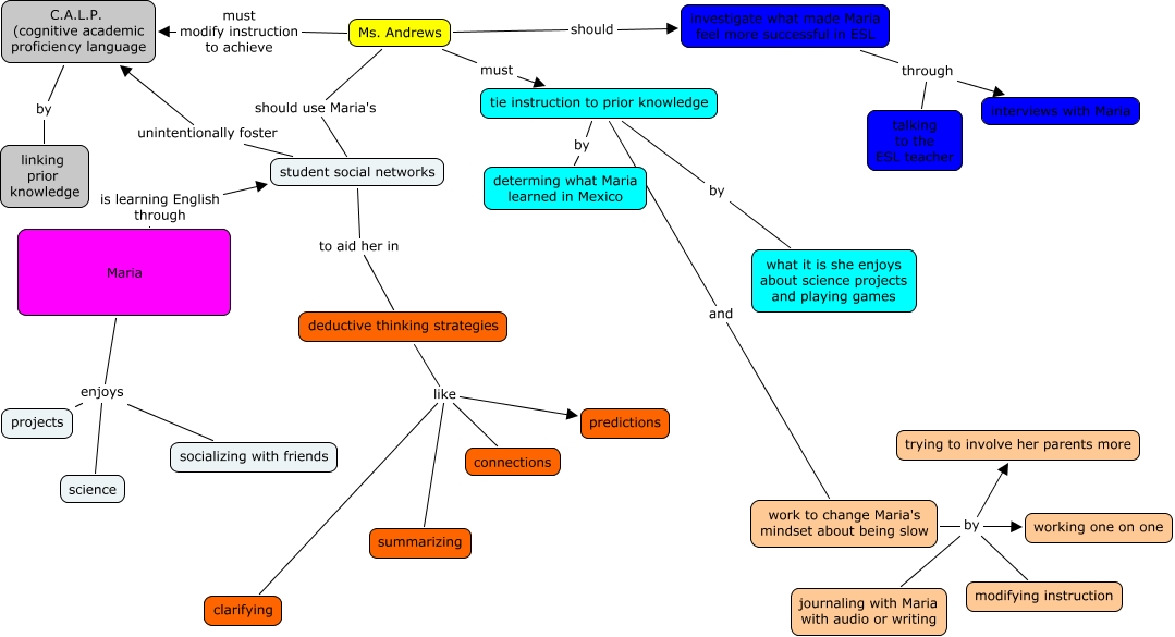 This Concept Map, created with IHMC CmapTools, has information related to: zumpano_maria, Maria enjoys socializing with friends, student social networks to aid her in deductive thinking strategies, Ms. Andrews must modify instruction to achieve C.A.L.P. (cognitive academic proficiency language, C.A.L.P. (cognitive academic proficiency language by linking prior knowledge, student social networks unintentionally foster C.A.L.P. (cognitive academic proficiency language, investigate what made Maria feel more successful in ESL through interviews with Maria, Maria is learning English through student social networks, tie instruction to prior knowledge by determing what Maria learned in Mexico, deductive thinking strategies like predictions, tie instruction to prior knowledge by what it is she enjoys about science projects and playing games, work to change Maria's mindset about being slow by working one on one, Ms. Andrews must tie instruction to prior knowledge, work to change Maria's mindset about being slow by journaling with Maria with audio or writing, deductive thinking strategies like summarizing, investigate what made Maria feel more successful in ESL through talking to the ESL teacher, work to change Maria's mindset about being slow by modifying instruction, deductive thinking strategies like connections, Ms. Andrews should investigate what made Maria feel more successful in ESL, deductive thinking strategies like clarifying, Maria enjoys projects