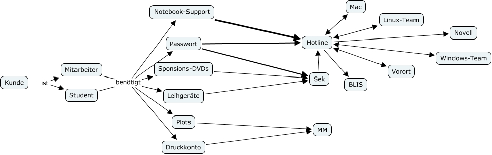 Dieses mit IHMC CmapTools erstellte CMap hat Informationen bezüglich: persönliche Kundeninteraktion, Hotline Vorort, Mitarbeiter benötigt Notebook-Support, Passwort Hotline, Student benötigt Druckkonto, Hotline BLIS, Student benötigt Notebook-Support, Mitarbeiter benötigt Leihgeräte, Student benötigt Sponsions-DVDs, Sek Hotline, Mitarbeiter benötigt Plots, Hotline Linux-Team, Mitarbeiter benötigt Sponsions-DVDs, Passwort Sek, Mitarbeiter benötigt Passwort, Kunde ist Student, Kunde ist Mitarbeiter, Student benötigt Plots, Student benötigt Passwort, Notebook-Support Hotline, Mitarbeiter benötigt Druckkonto