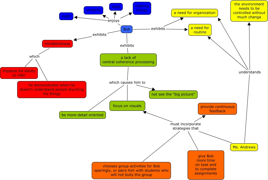 This Concept Map, created with IHMC CmapTools, has information related to: zumpano_bob, Bob exhibits a need for organization, a lack of central coherence processing which causes him to focus on visuals, Bob exhibits a lack of central coherence processing, Ms. Andrews understands a need for routine, Bob enjoys math, Ms. Andrews understands the environment needs to be controlled without much change, Bob enjoys kites, Ms. Andrews must incorporate strategies that focus on visuals, a lack of central coherence processing which causes him to not see the "big picture", a lack of central coherence processing which causes him to be more detail oriented, mindblindness which impares his ability to infer, mindblindness which he demonstrates when he doesn't understand people touching his things, Bob enjoys projects, Bob exhibits mindblindness, Ms. Andrews understands a need for organization, Ms. Andrews must incorporate strategies that provide continuous feedback, Bob enjoys making things, Ms. Andrews must incorporate strategies that give Bob more time on task and to complete assignments, Bob exhibits a need for routine, Ms. Andrews must incorporate strategies that chooses group activities for Bob sparingly, or pairs him with students who will not bully the group