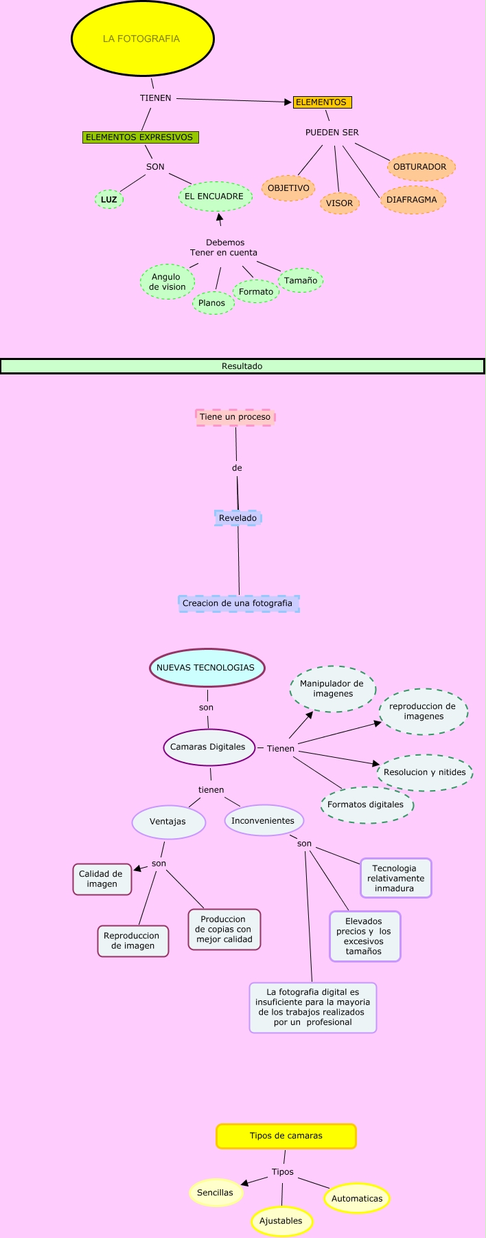 Este mapa conceptual tiene información relacionada a: LA FOTOGRAFIA, Camaras Digitales Tienen Formatos digitales, Ventajas son Calidad de imagen, NUEVAS TECNOLOGIAS son Camaras Digitales, Inconvenientes son Tecnologia relativamente inmadura, ELEMENTOS EXPRESIVOS SON LUZ, LA FOTOGRAFIA TIENEN ELEMENTOS EXPRESIVOS, Ventajas son Reproduccion de imagen, ELEMENTOS PUEDEN SER VISOR, Tiene un proceso de Creacion de una fotografia, Formato Debemos Tener en cuenta EL ENCUADRE