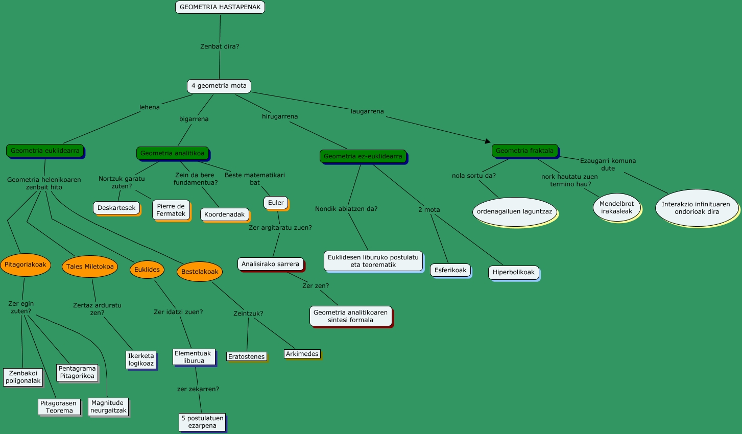 Este Cmap, tiene información relacionada con: Heriz_Lasaga_Mikel, Geometria analitikoa Zein da bere fundamentua? Koordenadak, Geometria euklidearra Geometria helenikoaren zenbait hito Pitagoriakoak, Geometria ez-euklidearra 2 mota Hiperbolikoak, Euklides Zer idatzi zuen? Elementuak liburua, 4 geometria mota laugarrena Geometria fraktala, GEOMETRIA HASTAPENAK Zenbat dira? 4 geometria mota, Pitagoriakoak Zer egin zuten? Zenbakoi poligonalak, 4 geometria mota lehena Geometria euklidearra, Geometria analitikoa Nortzuk garatu zuten? Deskartesek, Geometria analitikoa Beste matematikari bat Euler, Geometria euklidearra Geometria helenikoaren zenbait hito Euklides, Geometria ez-euklidearra 2 mota Esferikoak, Geometria euklidearra Geometria helenikoaren zenbait hito Tales Miletokoa, Tales Miletokoa Zertaz arduratu zen? Ikerketa logikoaz, Geometria fraktala nork hautatu zuen termino hau? Mendelbrot irakasleak, Bestelakoak Zeintzuk? Eratostenes, Geometria analitikoa Nortzuk garatu zuten? Pierre de Fermatek, Geometria euklidearra Geometria helenikoaren zenbait hito Bestelakoak, Elementuak liburua zer zekarren? 5 postulatuen ezarpena, 4 geometria mota hirugarrena Geometria ez-euklidearra