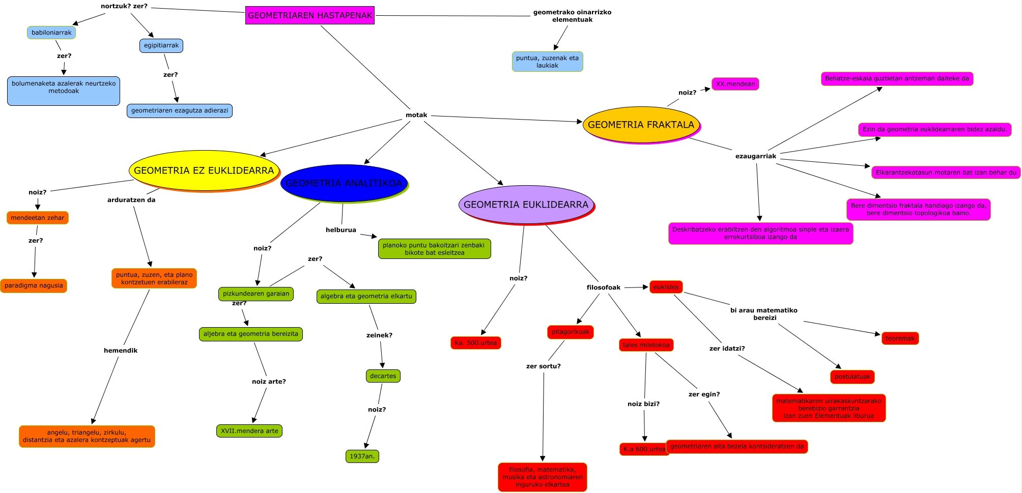 Este Cmap, tiene información relacionada con: illarramendi_olazabal_maider, euklides bi arau matematiko bereizi postulatuak, GEOMETRIAREN HASTAPENAK motak GEOMETRIA FRAKTALA, GEOMETRIA FRAKTALA ezaugarriak Deskribatzeko erabiltzen den algoritmoa sinple eta izaera errekurtsiboa izango da, GEOMETRIA EUKLIDEARRA filosofoak pitagorikoak, GEOMETRIA EUKLIDEARRA noiz? Ka. 500.urtea, babiloniarrak zer? bolumenaketa azalerak neurtzeko metodoak, GEOMETRIAREN HASTAPENAK motak GEOMETRIA EUKLIDEARRA, euklides bi arau matematiko bereizi teoremak, GEOMETRIA FRAKTALA ezaugarriak Bere dimentsio fraktala handiago izango da, bere dimentsio topologikoa baino., GEOMETRIA EZ EUKLIDEARRA noiz? mendeetan zehar, pitagorikoak zer sortu? filosofia, matematika, musika eta astronomiaren inguruko elkartea, puntua, zuzen, eta plano kontzetuen erabileraz hemendik angelu, triangelu, zirkulu, distantzia eta azalera kontzeptuak agertu, GEOMETRIA FRAKTALA ezaugarriak Behatze-eskala guztietan antzeman daiteke da, GEOMETRIAREN HASTAPENAK motak GEOMETRIA ANALITIKOA, pizkundearen garaian zer? aljebra eta geometria bereizita, algebra eta geometria elkartu zeinek? decartes, GEOMETRIAREN HASTAPENAK nortzuk? zer? egipitiarrak, aljebra eta geometria bereizita noiz arte? XVII.mendera arte, tales miletokoa zer egin? geometriaren aita bezela kontsideratzen da, GEOMETRIA FRAKTALA ezaugarriak Ezin da geometria euklidearraren bidez azaldu.