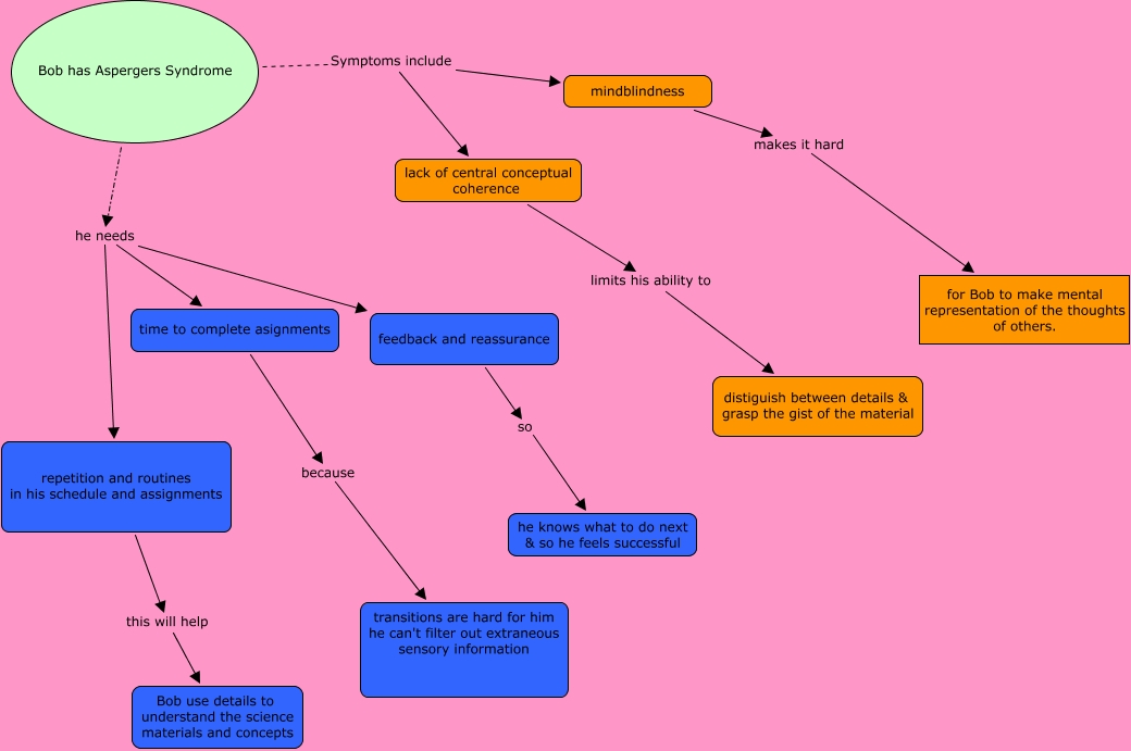 This Concept Map, created with IHMC CmapTools, has information related to: howse_module 2.4, repetition and routines in his schedule and assignments this will help Bob use details to understand the science materials and concepts, mindblindness makes it hard for Bob to make mental representation of the thoughts of others., Bob has Aspergers Syndrome he needs feedback and reassurance, lack of central conceptual coherence limits his ability to distiguish between details & grasp the gist of the material, Bob has Aspergers Syndrome Symptoms include mindblindness, feedback and reassurance so he knows what to do next & so he feels successful, Bob has Aspergers Syndrome he needs repetition and routines in his schedule and assignments, Bob has Aspergers Syndrome Symptoms include lack of central conceptual coherence, time to complete asignments because transitions are hard for him he can't filter out extraneous sensory information, Bob has Aspergers Syndrome he needs time to complete asignments