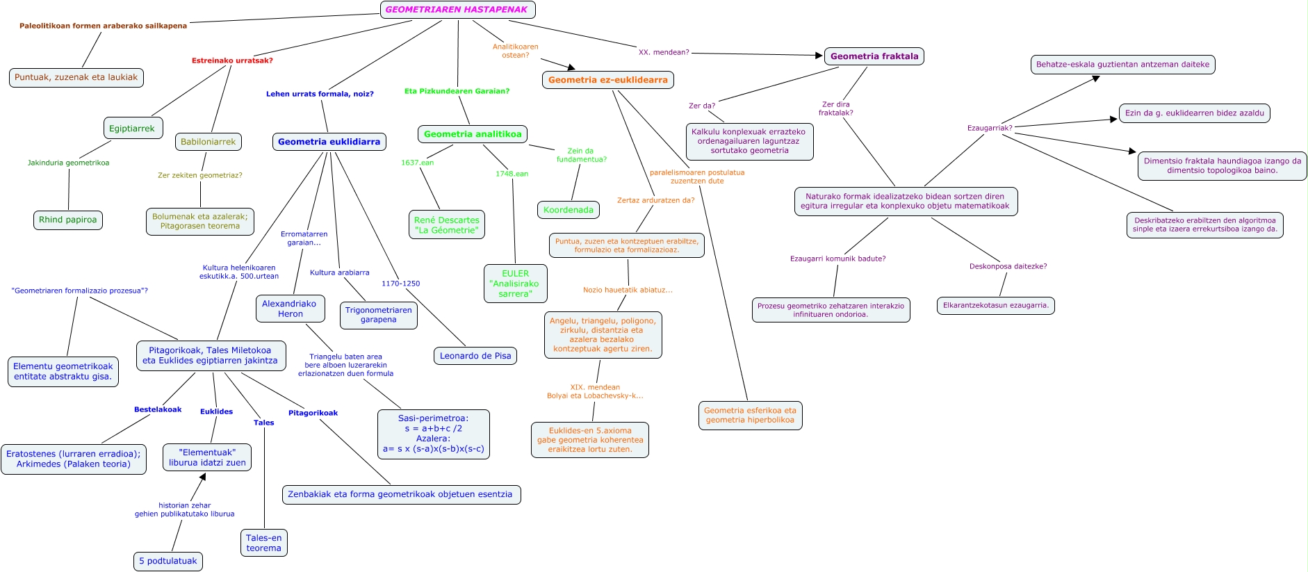 Este Cmap, tiene información relacionada con: Fuentes Arteaga, Ainhoa, Puntua, zuzen eta kontzeptuen erabiltze, formulazio eta formalizazioaz. Nozio hauetatik abiatuz... Angelu, triangelu, poligono, zirkulu, distantzia eta azalera bezalako kontzeptuak agertu ziren., GEOMETRIAREN HASTAPENAK Estreinako urratsak? Babiloniarrek, Geometria ez-euklidearra Zertaz arduratzen da? Puntua, zuzen eta kontzeptuen erabiltze, formulazio eta formalizazioaz., Naturako formak idealizatzeko bidean sortzen diren egitura irregular eta konplexuko objetu matematikoak Ezaugarriak? Ezin da g. euklidearren bidez azaldu, Geometria euklidiarra Erromatarren garaian... Alexandriako Heron, Geometria euklidiarra Kultura helenikoaren eskutikk.a. 500.urtean Pitagorikoak, Tales Miletokoa eta Euklides egiptiarren jakintza, Geometria fraktala Zer da? Kalkulu konplexuak errazteko ordenagailuaren laguntzaz sortutako geometria, Geometria euklidiarra 1170-1250 Leonardo de Pisa, Naturako formak idealizatzeko bidean sortzen diren egitura irregular eta konplexuko objetu matematikoak Ezaugarriak? Dimentsio fraktala haundiagoa izango da dimentsio topologikoa baino., GEOMETRIAREN HASTAPENAK Paleolitikoan formen araberako sailkapena Puntuak, zuzenak eta laukiak, GEOMETRIAREN HASTAPENAK XX. mendean? Geometria fraktala, Naturako formak idealizatzeko bidean sortzen diren egitura irregular eta konplexuko objetu matematikoak Deskonposa daitezke? Elkarantzekotasun ezaugarria., Egiptiarrek Jakinduria geometrikoa Rhind papiroa, Babiloniarrek Zer zekiten geometriaz? Bolumenak eta azalerak; Pitagorasen teorema, Geometria analitikoa 1748.ean EULER "Analisirako sarrera", Naturako formak idealizatzeko bidean sortzen diren egitura irregular eta konplexuko objetu matematikoak Ezaugarriak? Deskribatzeko erabiltzen den algoritmoa sinple eta izaera errekurtsiboa izango da., Angelu, triangelu, poligono, zirkulu, distantzia eta azalera bezalako kontzeptuak agertu ziren. XIX. mendean Bolyai eta Lobachevsky-k... Euklides-en 5.axioma gabe geometria koherentea eraikitzea lortu zuten., Pitagorikoak, Tales Miletokoa eta Euklides egiptiarren jakintza Bestelakoak Eratostenes (lurraren erradioa); Arkimedes (Palaken teoria), Pitagorikoak, Tales Miletokoa eta Euklides egiptiarren jakintza Tales Tales-en teorema, 5 podtulatuak historian zehar gehien publikatutako liburua "Elementuak" liburua idatzi zuen