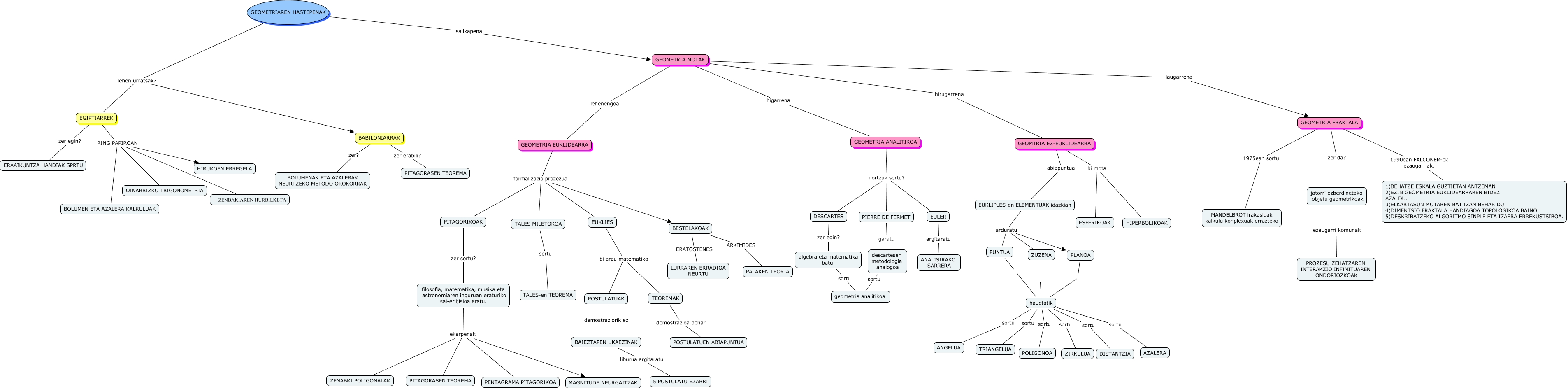 Este Cmap, tiene información relacionada con: ARANTZETA_LOPEZ_MAIDER, descartesen metodologia analogoa sortu geometria analitikoa, GEOMETRIAREN HASTEPENAK lehen urratsak? BABILONIARRAK, GEOMETRIA FRAKTALA 1975ean sortu MANDELBROT irakasleak kalkulu konplexuak errazteko, GEOMETRIA ANALITIKOA nortzuk sortu? PIERRE DE FERMET, EUKLIPLES-en ELEMENTUAK idazkian arduratu PUNTUA, BESTELAKOAK ARKIMIDES PALAKEN TEORIA, EUKLIPLES-en ELEMENTUAK idazkian arduratu PLANOA, EUKLIES bi arau matematiko TEOREMAK, hauetatik sortu TRIANGELUA, TALES MILETOKOA sortu TALES-en TEOREMA, POSTULATUAK demostraziorik ez BAIEZTAPEN UKAEZINAK, GEOMETRIA ANALITIKOA nortzuk sortu? EULER, TEOREMAK demostrazioa behar POSTULATUEN ABIAPUNTUA, filosofia, matematika, musika eta astronomiaren inguruan eraturiko sai-erlijisioa eratu. ekarpenak PITAGORASEN TEOREMA, GEOMETRIA EUKLIDEARRA formalizazio prozezua BESTELAKOAK, jatorri ezberdinetako objetu geometrikoak ezaugarri komunak PROZESU ZEHATZAREN INTERAKZIO INFINITUAREN ONDORIOZKOAK, PLANOA hauetatik, GEOMETRIA MOTAK hirugarrena GEOMTRIA EZ-EUKLIDEARRA, PIERRE DE FERMET garatu descartesen metodologia analogoa, GEOMETRIA MOTAK bigarrena GEOMETRIA ANALITIKOA