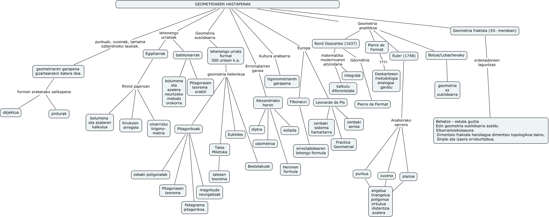 Este Cmap, tiene información relacionada con: irati iriarte alvarez, planoa ???? angelua triangelua poligonoa zirkulua distantzia azalera, Alexandriako heron ???? odometroa, GEOMETRIAREN HASTAPENAK Europa Leonarde de Pis, Egiptiarrak Rhind papiroan oinarrizko trigono- metria, GEOMETRIAREN HASTAPENAK puntuak, zuzenak, tamaina ezberdineko laukiak. geometriaren garapena gizartearekin batera doa., Alexandriako heron ???? Heronen formula, Leonarde de Pis ???? zenbaki seriea, Alexandriako heron ???? diptra, Egiptiarrak Rhind papiroan bolumena eta azalaren kalkulua, GEOMETRIAREN HASTAPENAK Kultura arabiarra tigonometriaren garapena, Leonarde de Pis ???? Practica Geometrial, Egiptiarrak Rhind papiroan hirukoen erregela, GEOMETRIAREN HASTAPENAK lehenengo urratsak babiloniarrak, GEOMETRIAREN HASTAPENAK ???? Geometria fraktala (XX. mendean), GEOMETRIAREN HASTAPENAK Geometria analitikoa Euler (1748), Pitagorikoak ???? Pitagorasen teorema, Geometria fraktala (XX. mendean) ordenadoreen laguntzaz Behatze - eskala guztia Ezin geometria euklidearra azaldu Elkarrantzekotasuna Dimentsio fraktala handiagoa dimentsio topologikoa baino. Sinple eta izaera errekurtsiboa., Fibonacci ???? erreztabidearen lehengo formula, GEOMETRIAREN HASTAPENAK Geometria euklidearra lehenengo urrats formal 500 urtean k.a., Pitagorikoak ma magnitude neurgaitzak