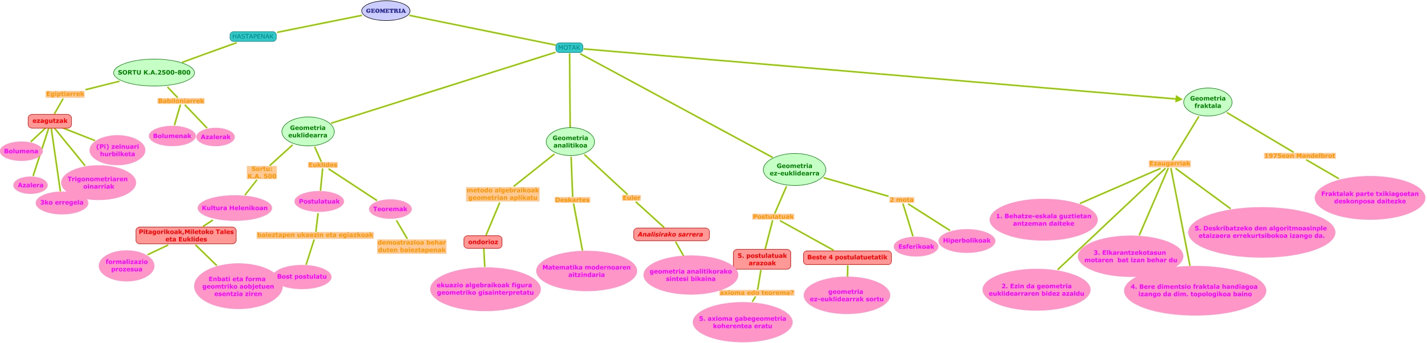 Este Cmap, tiene información relacionada con: Irizar_ Zumalabe Madalen, Kultura Helenikoan Pitagorikoak,Miletoko Tales eta Euklides formalizazio prozesua, ezagutzak ???? Bolumena, Geometria analitikoa Euler Analisirako sarrera, Geometria fraktala Ezaugarriak 4. Bere dimentsio fraktala handiagoa izango da dim. topologikoa baino, Geometria fraktala Ezaugarriak 3. Elkarantzekotasun motaren bat izan behar du, Geometria fraktala Ezaugarriak 5. Deskribatzeko den algoritmoasinple etaizaera errekurtsibokoa izango da., SORTU K.A.2500-800 Babiloniarrek Azalerak, SORTU K.A.2500-800 Babiloniarrek Bolumenak, SORTU K.A.2500-800 Egiptiarrek ezagutzak, GEOMETRIA HASTAPENAK SORTU K.A.2500-800, Geometria ez-euklidearra Postulatuak 5. postulatuak arazoak, Postulatuak baieztapen ukaezin eta egiazkoak Bost postulatu, GEOMETRIA MOTAK Geometria analitikoa, GEOMETRIA MOTAK Geometria fraktala, Beste 4 postulatuetatik ???? geometria ez-euklidearrak sortu, Geometria euklidearra Euklides Postulatuak, Geometria ez-euklidearra 2 mota Esferikoak, Geometria analitikoa Deskartes Matematika modernoaren aitzindaria, Geometria ez-euklidearra Postulatuak Beste 4 postulatuetatik, GEOMETRIA MOTAK Geometria ez-euklidearra
