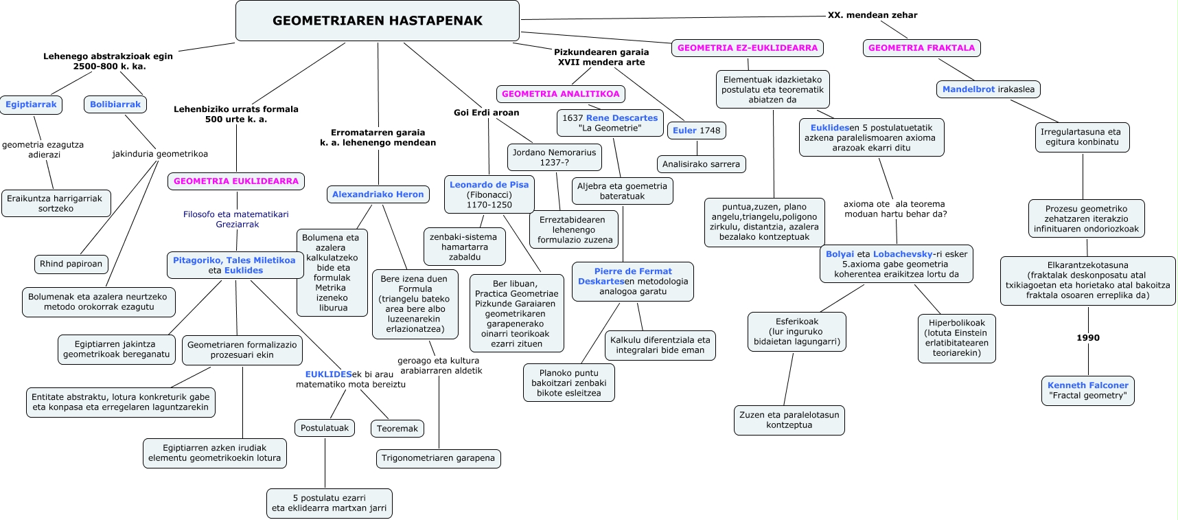 This Concept Map, created with IHMC CmapTools, has information related to: Urrejola_Barrutia_Iraia, Pitagoriko, Tales Miletikoa eta Euklides ???? Egiptiarren jakintza geometrikoak bereganatu, Pitagoriko, Tales Miletikoa eta Euklides EUKLIDESek bi arau matematiko mota bereiztu Teoremak, GEOMETRIA EUKLIDEARRA Filosofo eta matematikari Greziarrak Pitagoriko, Tales Miletikoa eta Euklides, Pitagoriko, Tales Miletikoa eta Euklides ???? Geometriaren formalizazio prozesuari ekin, GEOMETRIAREN HASTAPENAK ???? GEOMETRIA EZ-EUKLIDEARRA, Bere izena duen Formula (triangelu bateko area bere albo luzeenarekin erlazionatzea) geroago eta kultura arabiarraren aldetik Trigonometriaren garapena, Pitagoriko, Tales Miletikoa eta Euklides ???? Geometriaren formalizazio prozesuari ekin, GEOMETRIAREN HASTAPENAK Goi Erdi aroan Jordano Nemorarius 1237-?, Elementuak idazkietako postulatu eta teorematik abiatzen da ???? Euklidesen 5 postulatuetatik azkena paralelismoaren axioma arazoak ekarri ditu, Prozesu geometriko zehatzaren iterakzio infinituaren ondoriozkoak ???? Elkarantzekotasuna (fraktalak deskonposatu atal txikiagoetan eta horietako atal bakoitza fraktala osoaren erreplika da), Postulatuak ???? 5 postulatu ezarri eta eklidearra martxan jarri, Egiptiarrak geometria ezagutza adierazi Eraikuntza harrigarriak sortzeko, GEOMETRIAREN HASTAPENAK Lehenbiziko urrats formala 500 urte k. a. GEOMETRIA EUKLIDEARRA, GEOMETRIAREN HASTAPENAK Lehenego abstrakzioak egin 2500-800 k. ka. Egiptiarrak, GEOMETRIAREN HASTAPENAK Pizkundearen garaia XVII mendera arte Euler 1748, Leonardo de Pisa (Fibonacci) 1170-1250 ???? zenbaki-sistema hamartarra zabaldu, GEOMETRIAREN HASTAPENAK XX. mendean zehar GEOMETRIA FRAKTALA, Geometriaren formalizazio prozesuari ekin ???? Entitate abstraktu, lotura konkreturik gabe eta konpasa eta erregelaren laguntzarekin, Leonardo de Pisa (Fibonacci) 1170-1250 ???? ????, GEOMETRIA FRAKTALA ???? Mandelbrot irakaslea