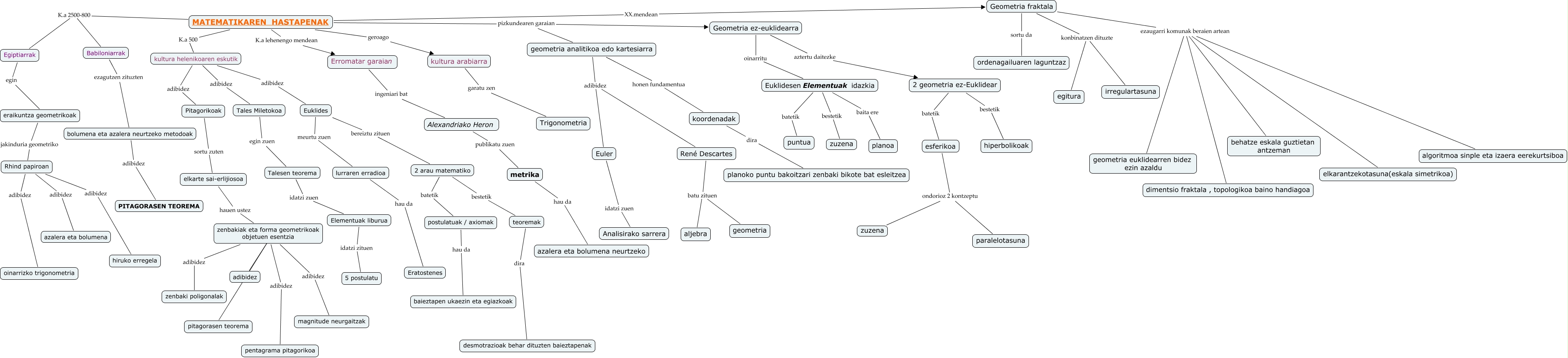 Este Cmap, tiene información relacionada con: Eriz_Urizar._Garazi, zenbakiak eta forma geometrikoak objetuen esentzia adibidez pentagrama pitagorikoa, Euklidesen Elementuak idazkia bestetik zuzena, Elementuak liburua idatzi zituen 5 postulatu, Babiloniarrak ezagutzen zituzten bolumena eta azalera neurtzeko metodoak, zenbakiak eta forma geometrikoak objetuen esentzia ???? pitagorasen teorema, MATEMATIKAREN HASTAPENAK K.a 2500-800 Egiptiarrak, Egiptiarrak egin eraikuntza geometrikoak, Rhind papiroan adibidez oinarrizko trigonometria, 2 arau matematiko batetik postulatuak / axiomak, Geometria fraktala sortu da ordenagailuaren laguntzaz, Erromatar garaian ingeniari bat Alexandriako Heron, esferikoa ondorioz 2 kontzeptu paralelotasuna, kultura arabiarra garatu zen Trigonometria, Euklidesen Elementuak idazkia batetik puntua, zenbakiak eta forma geometrikoak objetuen esentzia adibidez zenbaki poligonalak, Rhind papiroan adibidez azalera eta bolumena, Geometria fraktala ezaugarri komunak beraien artean behatze eskala guztietan antzeman, Pitagorikoak sortu zuten elkarte sai-erlijiosoa, Geometria fraktala ezaugarri komunak beraien artean dimentsio fraktala , topologikoa baino handiagoa, elkarte sai-erlijiosoa hauen ustez zenbakiak eta forma geometrikoak objetuen esentzia