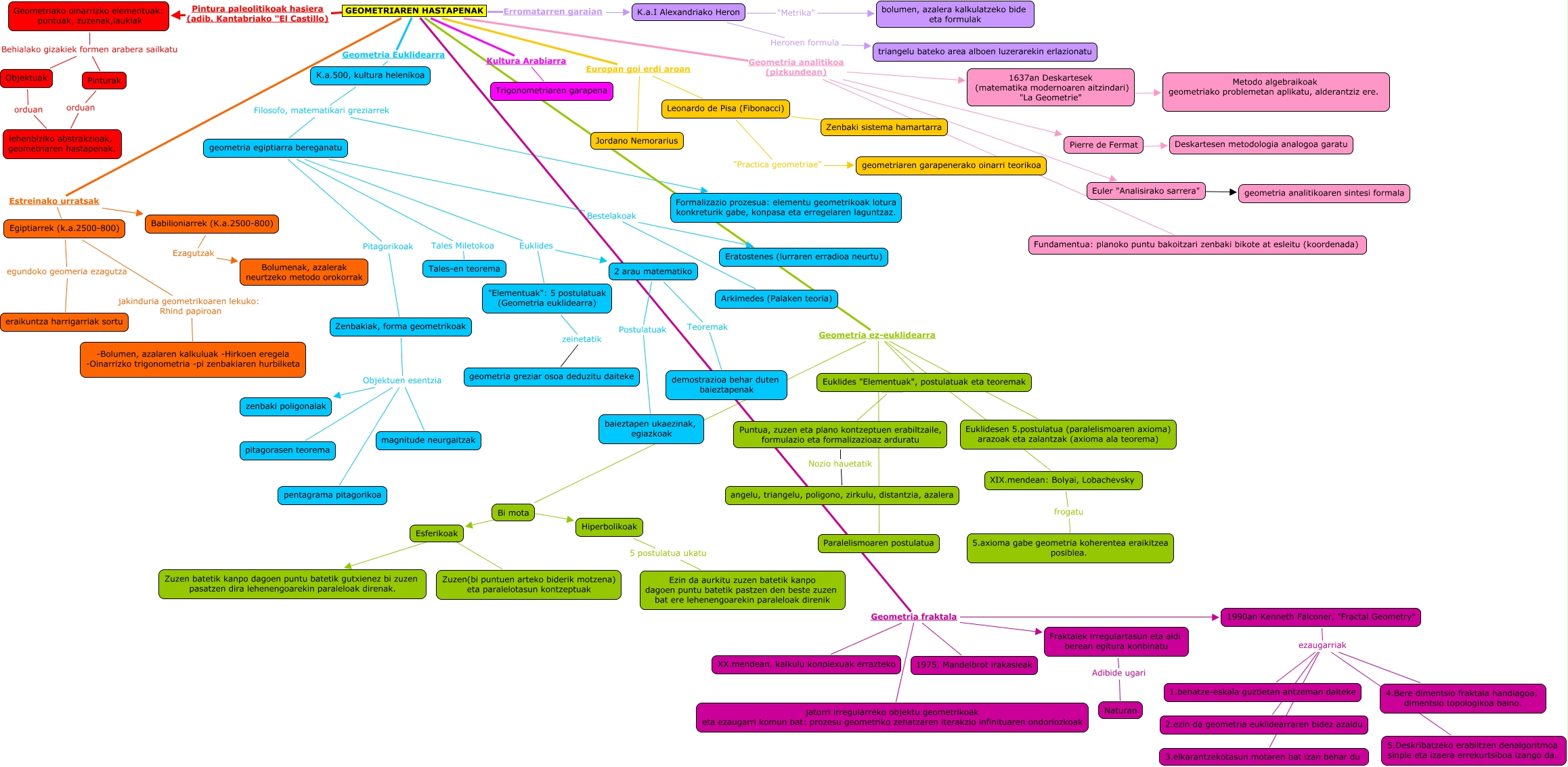 Este Cmap, tiene información relacionada con: Geometriaren hastapenak Garazi Martinez, Fraktalek irregulartasun eta aldi berean egitura konbinatu Adibide ugari Naturan, GEOMETRIAREN HASTAPENAK Geometria ez-euklidearra Euklidesen 5.postulatua (paralelismoaren axioma) arazoak eta zalantzak (axioma ala teorema), Egiptiarrek (k.a.2500-800) egundoko geomeria ezagutza eraikuntza harrigarriak sortu, Egiptiarrek (k.a.2500-800) jakinduria geometrikoaren lekuko: Rhind papiroan -Bolumen, azalaren kalkuluak -Hirkoen eregela -Oinarrizko trigonometria -pi zenbakiaren hurbilketa, Leonardo de Pisa (Fibonacci) "Practica geometriae" geometriaren garapenerako oinarri teorikoa, Zenbakiak, forma geometrikoak Objektuen esentzia pentagrama pitagorikoa, GEOMETRIAREN HASTAPENAK Geometria analitikoa (pizkundean) 1637an Deskartesek (matematika modernoaren aitzindari) "La Geometrie", 1990an Kenneth Falconer, "Fractal Geometry" ezaugarriak 1.behatze-eskala guztietan antzeman daiteke, 1990an Kenneth Falconer, "Fractal Geometry" ezaugarriak 4.Bere dimentsio fraktala handiagoa, dimentsio topologikoa baino., "Elementuak": 5 postulatuak (Geometria euklidearra) zeinetatik geometria greziar osoa deduzitu daiteke, GEOMETRIAREN HASTAPENAK Kultura Arabiarra Trigonometriaren garapena, GEOMETRIAREN HASTAPENAK Estreinako urratsak Babilioniarrek (K.a.2500-800), XIX.mendean: Bolyai, Lobachevsky frogatu 5.axioma gabe geometria koherentea eraikitzea posiblea., GEOMETRIAREN HASTAPENAK Geometria fraktala 1975, Mandelbrot irakasleak, Esferikoak ???? Zuzen batetik kanpo dagoen puntu batetik gutxienez bi zuzen pasatzen dira lehenengoarekin paraleloak direnak., geometria egiptiarra bereganatu Pitagorikoak Zenbakiak, forma geometrikoak, GEOMETRIAREN HASTAPENAK Estreinako urratsak Egiptiarrek (k.a.2500-800), geometria egiptiarra bereganatu Tales Miletokoa Tales-en teorema, GEOMETRIAREN HASTAPENAK Europan goi erdi aroan Jordano Nemorarius, K.a.I Alexandriako Heron Heronen formula triangelu bateko area alboen luzerarekin erlazionatu