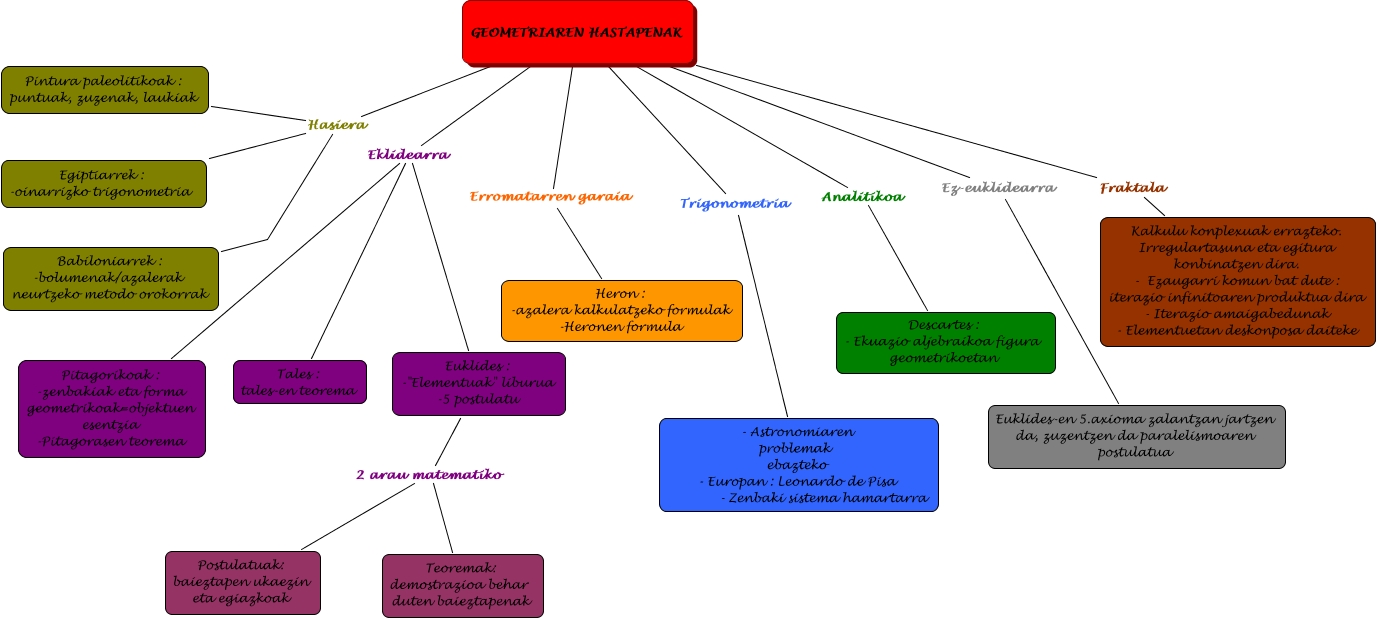 Este Cmap, tiene información relacionada con: AGUIRRE_AMAIA, GEOMETRIAREN HASTAPENAK Eklidearra Pitagorikoak : -zenbakiak eta forma geometrikoak=objektuen esentzia -Pitagorasen teorema, GEOMETRIAREN HASTAPENAK Fraktala Kalkulu konplexuak errazteko. Irregulartasuna eta egitura konbinatzen dira. - Ezaugarri komun bat dute : iterazio infinitoaren produktua dira - Iterazio amaigabedunak - Elementuetan deskonposa daiteke, GEOMETRIAREN HASTAPENAK Erromatarren garaia Heron : -azalera kalkulatzeko formulak -Heronen formula, GEOMETRIAREN HASTAPENAK Eklidearra Euklides : -"Elementuak" liburua -5 postulatu, GEOMETRIAREN HASTAPENAK Ez-euklidearra Euklides-en 5.axioma zalantzan jartzen da, zuzentzen da paralelismoaren postulatua, Euklides : -"Elementuak" liburua -5 postulatu 2 arau matematiko Teoremak: demostrazioa behar duten baieztapenak, GEOMETRIAREN HASTAPENAK Eklidearra Tales : tales-en teorema, Babiloniarrek : -bolumenak/azalerak neurtzeko metodo orokorrak Hasiera Pintura paleolitikoak : puntuak, zuzenak, laukiak, GEOMETRIAREN HASTAPENAK Hasiera Pintura paleolitikoak : puntuak, zuzenak, laukiak, Egiptiarrek : -oinarrizko trigonometria Hasiera Pintura paleolitikoak : puntuak, zuzenak, laukiak, GEOMETRIAREN HASTAPENAK Analitikoa Descartes : - Ekuazio aljebraikoa figura geometrikoetan, GEOMETRIAREN HASTAPENAK Trigonometria - Astronomiaren problemak ebazteko - Europan : Leonardo de Pisa - Zenbaki sistema hamartarra, Euklides : -"Elementuak" liburua -5 postulatu 2 arau matematiko Postulatuak: baieztapen ukaezin eta egiazkoak