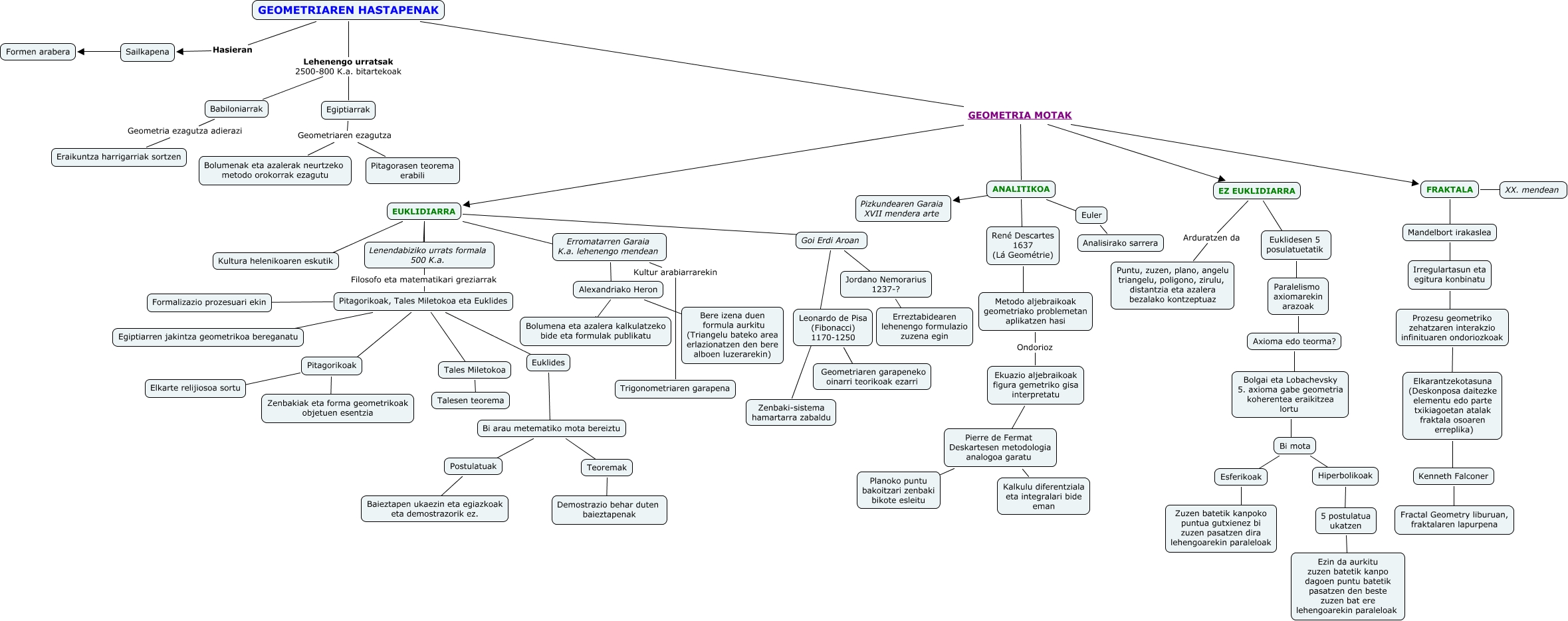 Este Cmap, tiene información relacionada con: Ochoa de Retana Elorza, María, Postulatuak ???? Baieztapen ukaezin eta egiazkoak eta demostrazorik ez., Elkarantzekotasuna (Deskonposa daitezke elementu edo parte txikiagoetan atalak fraktala osoaren erreplika) ???? Kenneth Falconer, Kenneth Falconer ???? Fractal Geometry liburuan, fraktalaren lapurpena, Babiloniarrak Geometria ezagutza adierazi Eraikuntza harrigarriak sortzen, Pierre de Fermat Deskartesen metodologia analogoa garatu ???? Planoko puntu bakoitzari zenbaki bikote esleitu, EUKLIDIARRA Filosofo eta matematikari greziarrak Pitagorikoak, Tales Miletokoa eta Euklides, GEOMETRIAREN HASTAPENAK Lehenengo urratsak 2500-800 K.a. bitartekoak Egiptiarrak, Leonardo de Pisa (Fibonacci) 1170-1250 ???? Zenbaki-sistema hamartarra zabaldu, Esferikoak ???? Zuzen batetik kanpoko puntua gutxienez bi zuzen pasatzen dira lehengoarekin paraleloak, EZ EUKLIDIARRA ???? Euklidesen 5 posulatuetatik, Hiperbolikoak ???? 5 postulatua ukatzen, Pitagorikoak E Elkarte relijiosoa sortu, GEOMETRIAREN HASTAPENAK Hasieran Sailkapena, EUKLIDIARRA ???? Lenendabiziko urrats formala 500 K.a., Goi Erdi Aroan ???? Jordano Nemorarius 1237-?, EUKLIDIARRA ???? Erromatarren Garaia K.a. lehenengo mendean, GEOMETRIAREN HASTAPENAK Lehenengo urratsak 2500-800 K.a. bitartekoak Babiloniarrak, GEOMETRIAREN HASTAPENAK GEOMETRIA MOTAK FRAKTALA, GEOMETRIAREN HASTAPENAK GEOMETRIA MOTAK EZ EUKLIDIARRA, ANALITIKOA ???? Pizkundearen Garaia XVII mendera arte