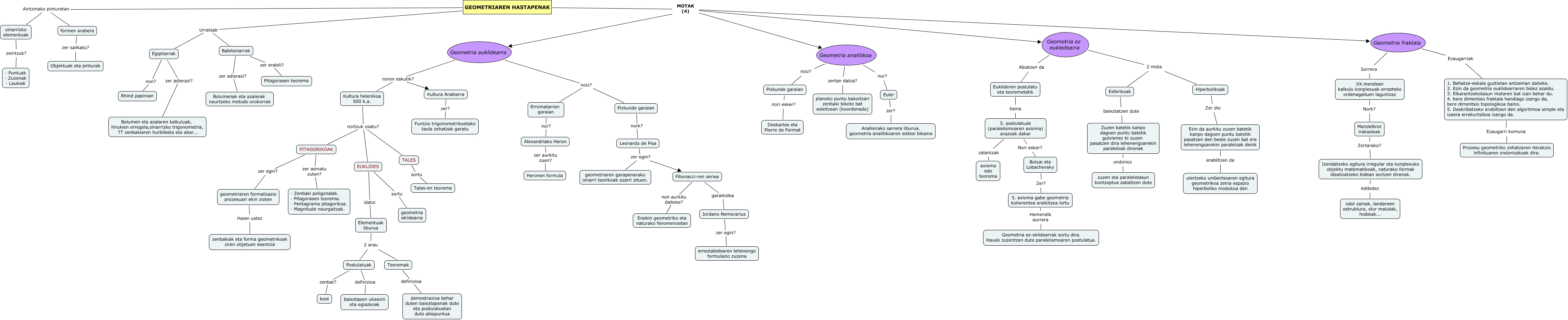 Este Cmap, tiene información relacionada con: HUARTE_LUISA, Geometria fraktala Ezaugarriak 1. Behatze-eskala guztietan antzeman daiteke. 2. Ezin da geometria euklidearraren bidez azaldu. 3. Elkarantzekotasun motaren bat izan behar du. 4. bere dimentsio fraktala handiago izango da, bere dimentsio topologikoa baino. 5. Deskribatzeko erabiltzen den algoritmoa simple eta izaera errekurtsiboa izango da., Geometria ez eukledearra 2 mota Hiperbolikoak, Zuzen batetik kanpo dagoen puntu batetik gutxienez bi zuzen pasatzen dira lehenengoarekin paraleloak direnak ondorioz zuzen eta paralelotasun kontzeptua zabaltzen dute, Geometria ez eukledearra 2 mota Esferikoak, 5. axioma gabe geometria koherentea eraikitzea lortu Hemendik aurrera Geometria ez-eklidearrak sortu dira. Hauek zuzentzen dute paralelismoaren postulatua., GEOMETRIAREN HASTAPENAK Urratsak Babiloniarrak, formen arabera zer sailkatu? Objektuak eta pinturak, Geometria euklidearra noren eskutik? Kultura helenikoa 500 k.a., Geometria euklidearra noren eskutik? Kultura Arabiarra, Elementuak liburua 2 arau Postulatuak, Ezin da aurkitu zuzen batetik kanpo dagoen puntu batetik pasatzen den beste zuzen bat ere lehenengoarekin paraleloak denik erabiltzen da ulertzeko unibertsoaren egitura geometrikoa zeina espazio hiperboliko modukoa den, Erromatarren garaian nor? Alexandriako Heron, Kultura helenikoa 500 k.a. nortzuk osatu? TALES, Egiptiarrak non? Rhind papiroan, PITAGORIKOAK zer egin? geometriaren formalizazio prozesuari ekin zioten, TALES sortu Tales-en teorema, GEOMETRIAREN HASTAPENAK MOTAK (4) Geometria fraktala, Hiperbolikoak Zer dio Ezin da aurkitu zuzen batetik kanpo dagoen puntu batetik pasatzen den beste zuzen bat ere lehenengoarekin paraleloak denik, Esferikoak baieztatzen dute Zuzen batetik kanpo dagoen puntu batetik gutxienez bi zuzen pasatzen dira lehenengoarekin paraleloak direnak, 5. postulatuak (paralelismoaren axioma) arazoak dakar Nori esker? Bolyai eta Lobachevsky