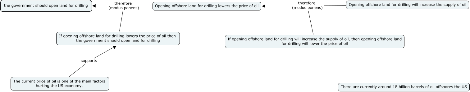 This Concept Map, created with IHMC CmapTools, has information related to: US_drill, If opening offshore land for drilling lowers the price of oil then the government should open land for drilling therefore (modus ponens) the government should open land for drilling, Opening offshore land for drilling lowers the price of oil therefore (modus ponens) the government should open land for drilling, If opening offshore land for drilling will increase the supply of oil, then opening offshore land for drilling will lower the price of oil therefore (modus ponens) Opening offshore land for drilling lowers the price of oil, Opening offshore land for drilling will increase the supply of oil therefore (modus ponens) Opening offshore land for drilling lowers the price of oil, The current price of oil is one of the main factors hurting the US economy. supports If opening offshore land for drilling lowers the price of oil then the government should open land for drilling