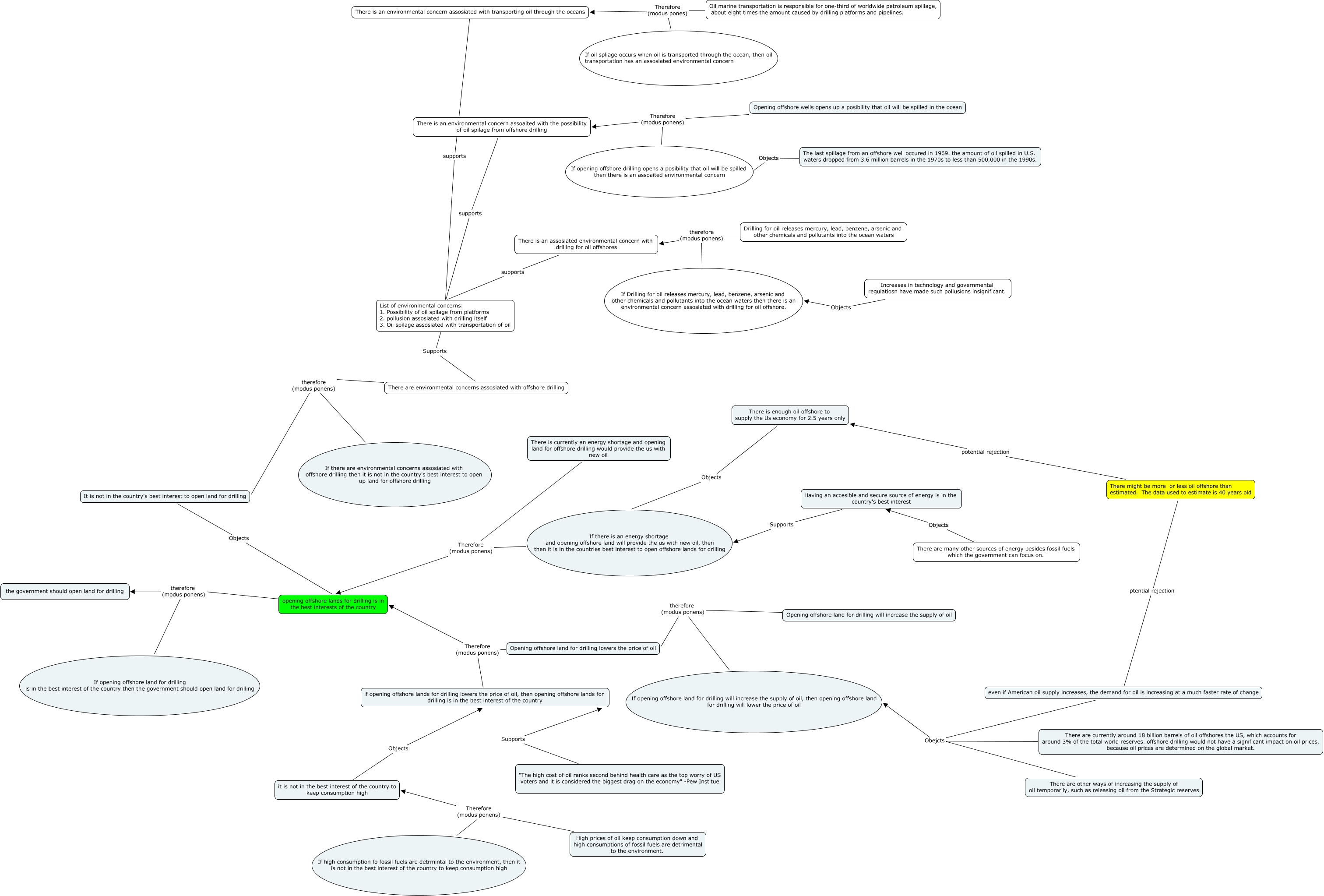This Concept Map has information related to: US_drill, There is enough oil offshore to supply the Us economy for 2.5 years only Objects If there is an energy shortage and opening offshore land will provide the us with new oil, then then it is in the countries best interest to open offshore lands for drilling, If high consumption fo fossil fuels are detrmintal to the environment, then it is not in the best interest of the country to keep consumption high Therefore (modus ponens) it is not in the best interest of the country to keep consumption high, Opening offshore wells opens up a posibility that oil will be spilled in the ocean Therefore (modus ponens) There is an environmental concern assoaited with the possibility of oil spilage from offshore drilling, There might be more or less oil offshore than estimated. The data used to estimate is 40 years old potential rejection There is enough oil offshore to supply the Us economy for 2.5 years only, If Drilling for oil releases mercury, lead, benzene, arsenic and other chemicals and pollutants into the ocean waters then there is an environmental concern assosiated with drilling for oil offshore. therefore (modus ponens) There is an assosiated environmental concern with drilling for oil offshores, If there is an energy shortage and opening offshore land will provide the us with new oil, then then it is in the countries best interest to open offshore lands for drilling Therefore (modus ponens) opening offshore lands for drilling is in the best interests of the country, Opening offshore land for drilling lowers the price of oil Therefore (modus ponens) opening offshore lands for drilling is in the best interests of the country, There is an assosiated environmental concern with drilling for oil offshores supports List of environmental concerns: 1. Possibility of oil spilage from platforms 2. pollusion assosiated with drilling itself 3. Oil spilage assosiated with transportation of oil, High prices of oil keep consumption down and high consumptions of fossil fuels are detrimental to the environment. Therefore (modus ponens) it is not in the best interest of the country to keep consumption high, Oil marine transportation is responsible for one-third of worldwide petroleum spillage, about eight times the amount caused by drilling platforms and pipelines. Therefore (modus pones) There is an environmental concern assosiated with transporting oil through the oceans