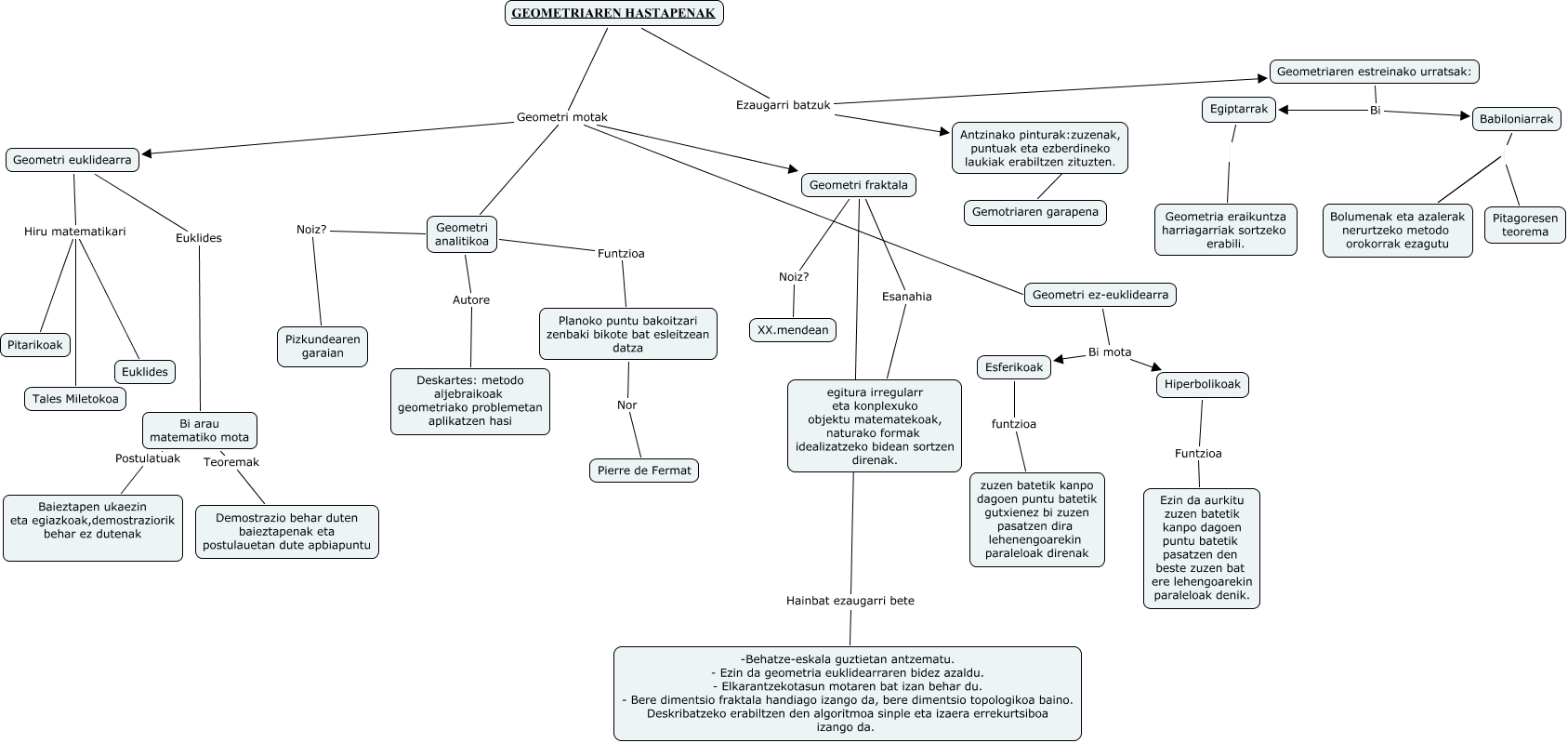 Este Cmap, tiene información relacionada con: jausoro_ aitziber, Geometri analitikoa Noiz? Pizkundearen garaian, Geometriaren estreinako urratsak: Bi Egiptarrak, GEOMETRIAREN HASTAPENAK Geometri motak Geometri analitikoa, Antzinako pinturak:zuzenak, puntuak eta ezberdineko laukiak erabiltzen zituzten. Gemotriaren garapena, Babiloniarrak Pitagoresen teorema, Geometri euklidearra Hiru matematikari Euklides, Egiptarrak Geometria eraikuntza harriagarriak sortzeko erabili., Bi arau matematiko mota Postulatuak Baieztapen ukaezin eta egiazkoak,demostraziorik behar ez dutenak, GEOMETRIAREN HASTAPENAK Geometri motak Geometri euklidearra, Geometri analitikoa Autore Deskartes: metodo aljebraikoak geometriako problemetan aplikatzen hasi, Hiperbolikoak Funtzioa Ezin da aurkitu zuzen batetik kanpo dagoen puntu batetik pasatzen den beste zuzen bat ere lehengoarekin paraleloak denik., GEOMETRIAREN HASTAPENAK Ezaugarri batzuk Geometriaren estreinako urratsak:, Geometri euklidearra Hiru matematikari Tales Miletokoa, Geometri fraktala Esanahia egitura irregularr eta konplexuko objektu matematekoak, naturako formak idealizatzeko bidean sortzen direnak., GEOMETRIAREN HASTAPENAK Ezaugarri batzuk Antzinako pinturak:zuzenak, puntuak eta ezberdineko laukiak erabiltzen zituzten., Geometri ez-euklidearra Bi mota Hiperbolikoak, Bi arau matematiko mota Teoremak Demostrazio behar duten baieztapenak eta postulauetan dute apbiapuntu, Geometri fraktala Noiz? XX.mendean, Geometri ez-euklidearra Bi mota Esferikoak, Geometri euklidearra Hiru matematikari Pitarikoak