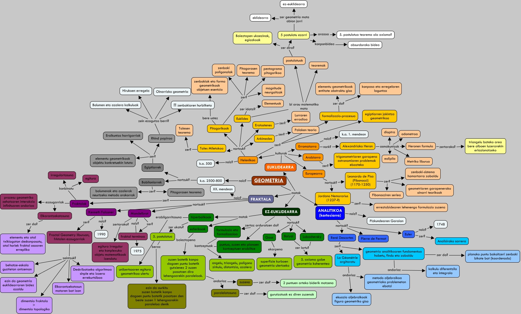 Este Cmap, tiene información relacionada con: Fernández de Gamboa Vázquez, Karla, Alexandriako Heron asmakuntzak odometroa, Erromatarra noiz? k.a. 1. mendean, Euler noiz? 1748, Lobachevsky zer lortu? 5. axioma gabe geometria koherentea, Elkarantzekotasuna zer da? elementu eta atal txikiagotan deskonposatu, atal horiek fraktal osoaren erreplika, Egiptiarrek zer? elementu geometrikoak objektu konkretuekin lotuta, FRAKTALA noiz? XX. mendean, FRAKTALA nortzuk? Kenneth Falconer, formulazio eta formalizazioa kontzeptuak angelu, triangelu, poligono zirkulu, distantzia, azalera, Helenikoa nortzuk? Pitagorikoak, EUKLIDEARRA kulturak Helenikoa, ANALITIKOA (kartesiarra) nortzuk? Pierre de Fermat, hiperbolikoak erabilgarritasuna unibertsoaren egitura geometrikoa ulertu, GEOMETRIA motak EZ-EUKLIDEARRA, Gaus ekarpena superfizie kurboen geometria ulertzeko, postulatuak zer dira? Baieztapen ukaezinak, egiazkoak, Alexandriako Heron asmakuntzak dioptra, Leonardo de Pisa (Fibonacci) (1170-1250) zer? zenbaki-sistema hamartarra zabaldu, EZ-EUKLIDEARRA motak esferikoak, zuzen batetik kanpo dagoen puntu batetik gutxienez 2 zuzen pasatzen dira lehengoarekin paraleloak. ondorioz zuzena