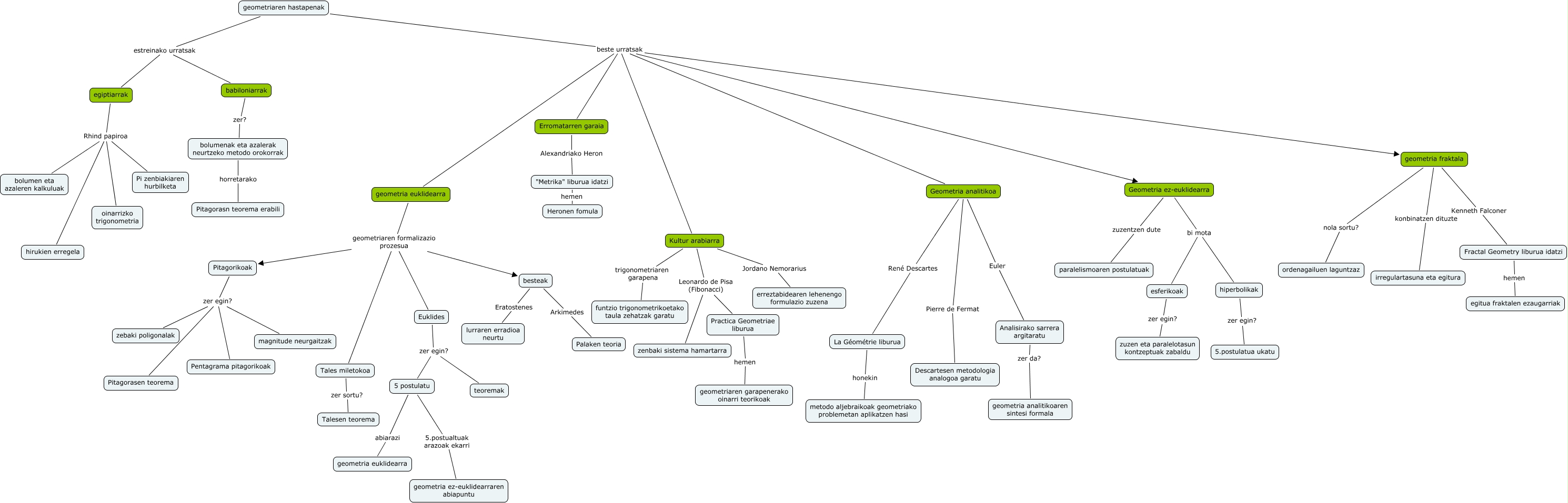 Este Cmap, tiene información relacionada con: Ansorregi_Txurruka_Amaia, geometriaren hastapenak beste urratsak Geometria ez-euklidearra, Kultur arabiarra Leonardo de Pisa (Fibonacci) zenbaki sistema hamartarra, Geometria analitikoa Euler Analisirako sarrera argitaratu, Geometria ez-euklidearra bi mota esferikoak, geometriaren hastapenak beste urratsak geometria euklidearra, Pitagorikoak zer egin? magnitude neurgaitzak, Geometria analitikoa Pierre de Fermat Descartesen metodologia analogoa garatu, Geometria analitikoa René Descartes La Géométrie liburua, Pitagorikoak zer egin? zebaki poligonalak, Kultur arabiarra Jordano Nemorarius erreztabidearen lehenengo formulazio zuzena, Euklides zer egin? 5 postulatu, Erromatarren garaia Alexandriako Heron "Metrika" liburua idatzi, Kultur arabiarra trigonometriaren garapena funtzio trigonometrikoetako taula zehatzak garatu, Fractal Geometry liburua idatzi hemen egitua fraktalen ezaugarriak, besteak Eratostenes lurraren erradioa neurtu, geometriaren hastapenak beste urratsak Erromatarren garaia, geometria euklidearra geometriaren formalizazio prozesua Pitagorikoak, geometriaren hastapenak beste urratsak geometria fraktala, La Géométrie liburua honekin metodo aljebraikoak geometriako problemetan aplikatzen hasi, geometria fraktala nola sortu? ordenagailuen laguntzaz