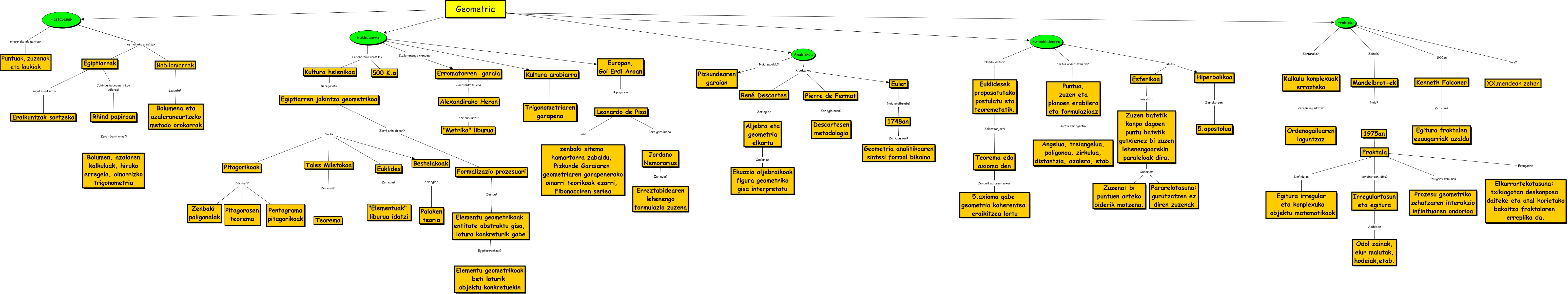Este Cmap, tiene información relacionada con: Guillan, Esnaola Oihane, Fraktala Noiz? XX.mendean zehar, Pitagorikoak Zer egin? Pentagrama pitagorikoak, Pierre de Fermat Zer egin zuen? Descartesen metodologia, Analitikoa Aipatzekoa René Descartes, Alexandirako Heron Zer publikatu? "Metrika" liburua, Bestelakoak Zer egin? Palaken teoria, Hiperbolikoa Zer ukatzen 5.apostolua, Geometria ???? Hastapenak, Analitikoa Noiz zabaldu? Pizkundearen garaian, Europan, Goi Erdi Aroan Aipagarria Leonardo de Pisa, Euklidearra Lehenbiziko urratsak Kultura helenikoa, Ez-euklidearra Zertaz arduratzen da? Puntua, zuzen eta planoen erabilera eta formulazioaz, Ez-euklidearra Nondik dator? Euklidesek proposatutako postulatu eta teoremetatik., Hastapenak estreinako urratsak Babiloniarrak, Egiptiarrak Ezagutza adierazi Eraikuntzak sortzeko, Egiptiarrak Jakinduria geometrikoa adierazi Rhind papiroan, Euler Noiz argitaratu? 1748an, Egiptiarren jakintza geometrikoa Nork? Pitagorikoak, Analitikoa Aipatzekoa Pierre de Fermat, Euklidearra ???? Europan, Goi Erdi Aroan