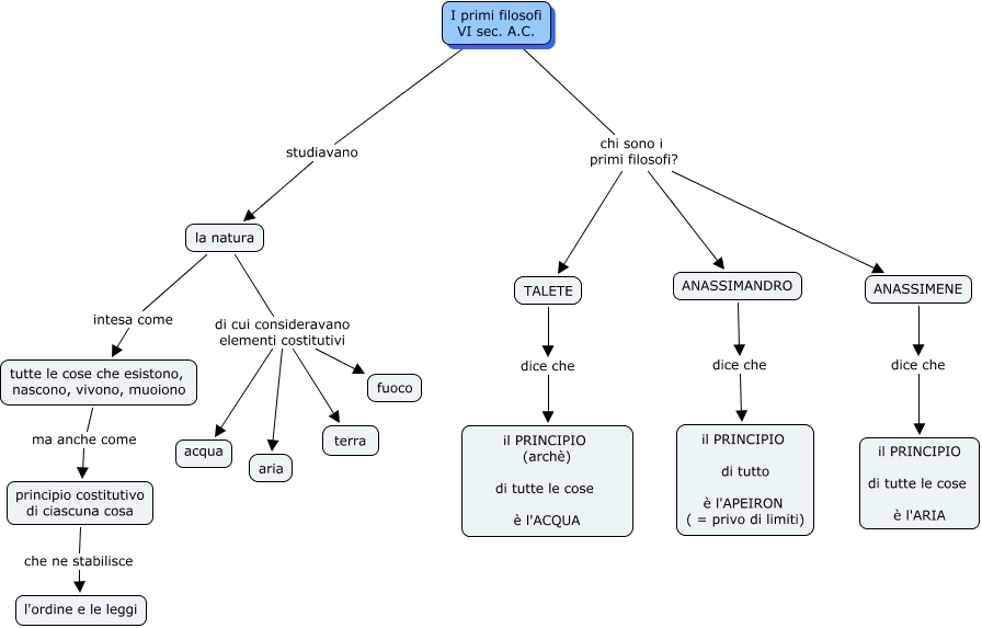 Questa Cmap, creata con IHMC CmapTools, contiene informazioni relative a: 02 - I primi filosofi TALETE, ANASSIMANDRO, AMNASSIMENE, la natura intesa come tutte le cose che esistono, nascono, vivono, muoiono, I primi filosofi VI sec. A.C. chi sono i primi filosofi? ANASSIMENE, I primi filosofi VI sec. A.C. studiavano la natura, principio costitutivo di ciascuna cosa che ne stabilisce l'ordine e le leggi, I primi filosofi VI sec. A.C. chi sono i primi filosofi? ANASSIMANDRO, la natura di cui consideravano elementi costitutivi acqua, I primi filosofi VI sec. A.C. chi sono i primi filosofi? TALETE, ANASSIMANDRO dice che il PRINCIPIO di tutto è l'APEIRON ( = privo di limiti), la natura di cui consideravano elementi costitutivi aria, TALETE dice che il PRINCIPIO (archè) di tutte le cose è l'ACQUA, ANASSIMENE dice che il PRINCIPIO di tutte le cose è l'ARIA, tutte le cose che esistono, nascono, vivono, muoiono ma anche come principio costitutivo di ciascuna cosa, la natura di cui consideravano elementi costitutivi terra, la natura di cui consideravano elementi costitutivi fuoco