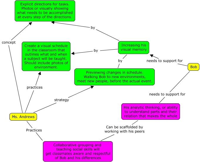This Concept Map, created with IHMC CmapTools, has information related to: L. Johnson_Bob_4, Ms. Andrews concept Explicit directions for tasks. Photos or visually showing what needs to be accomplished at every step of the directions., Increasing his visual memory by Create a visual schedule in the classroom that outlines what and when a subject will be taught. Should include photos of environment., Bob needs to support for His analytic thinking, or ability to understand parts and their relation that makes the whole, Ms. Andrews practices Create a visual schedule in the classroom that outlines what and when a subject will be taught. Should include photos of environment., Ms. Andrews Practices Collaborative grouping and teaching social skills will get classmates aware and respectful of Bob and his differences, Bob needs to support for Increasing his visual memory, His analytic thinking, or ability to understand parts and their relation that makes the whole Can be scaffolded by working with his peers Collaborative grouping and teaching social skills will get classmates aware and respectful of Bob and his differences, Ms. Andrews strategy Previewing changes in schedule. Walking Bob to new environments, meet new people, before the actual event., Increasing his visual memory by Explicit directions for tasks. Photos or visually showing what needs to be accomplished at every step of the directions., Increasing his visual memory by Previewing changes in schedule. Walking Bob to new environments, meet new people, before the actual event.