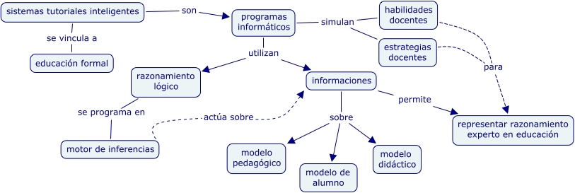 Este Cmap, tiene información relacionada con: ITS, informaciones sobre modelo de alumno, programas informáticos utilizan razonamiento lógico, informaciones sobre modelo pedagógico, programas informáticos simulan habilidades docentes, programas informáticos simulan estrategias docentes, informaciones sobre modelo didáctico, programas informáticos utilizan informaciones, estrategias docentes para representar razonamiento experto en educación, sistemas tutoriales inteligentes son programas informáticos, sistemas tutoriales inteligentes se vincula a educación formal, motor de inferencias actúa sobre informaciones, razonamiento lógico se programa en motor de inferencias, informaciones permite representar razonamiento experto en educación, habilidades docentes para representar razonamiento experto en educación