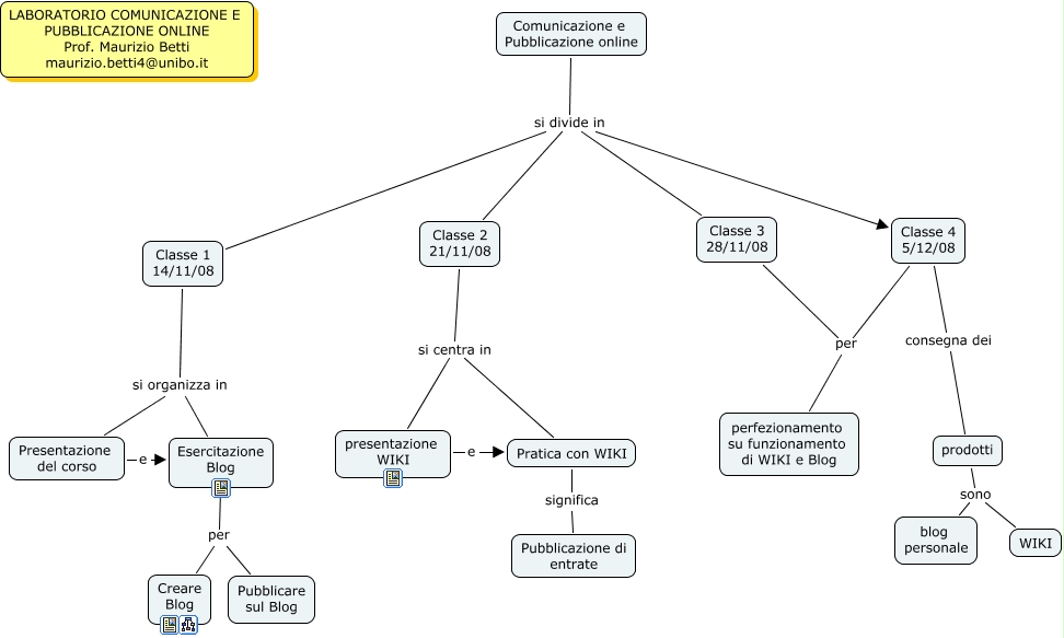 Este Cmap, tiene información relacionada con: Struttura Laboratorio Comunicazone e Pubblicazione online, prodotti sono blog personale, Comunicazione e Pubblicazione online si divide in Classe 1 14/11/08, Classe 4 5/12/08 consegna dei prodotti, Comunicazione e Pubblicazione online si divide in Classe 4 5/12/08, Classe 3 28/11/08 per perfezionamento su funzionamento di WIKI e Blog, Classe 2 21/11/08 si centra in presentazione WIKI, prodotti sono WIKI, Classe 1 14/11/08 si organizza in Esercitazione Blog, Pratica con WIKI significa Pubblicazione di entrate, Classe 2 21/11/08 si centra in Pratica con WIKI, Comunicazione e Pubblicazione online si divide in Classe 3 28/11/08, Esercitazione Blog per Creare Blog, Esercitazione Blog per Pubblicare sul Blog, Classe 4 5/12/08 per perfezionamento su funzionamento di WIKI e Blog, Presentazione del corso e Esercitazione Blog, Classe 1 14/11/08 si organizza in Presentazione del corso, presentazione WIKI e Pratica con WIKI, Comunicazione e Pubblicazione online si divide in Classe 2 21/11/08