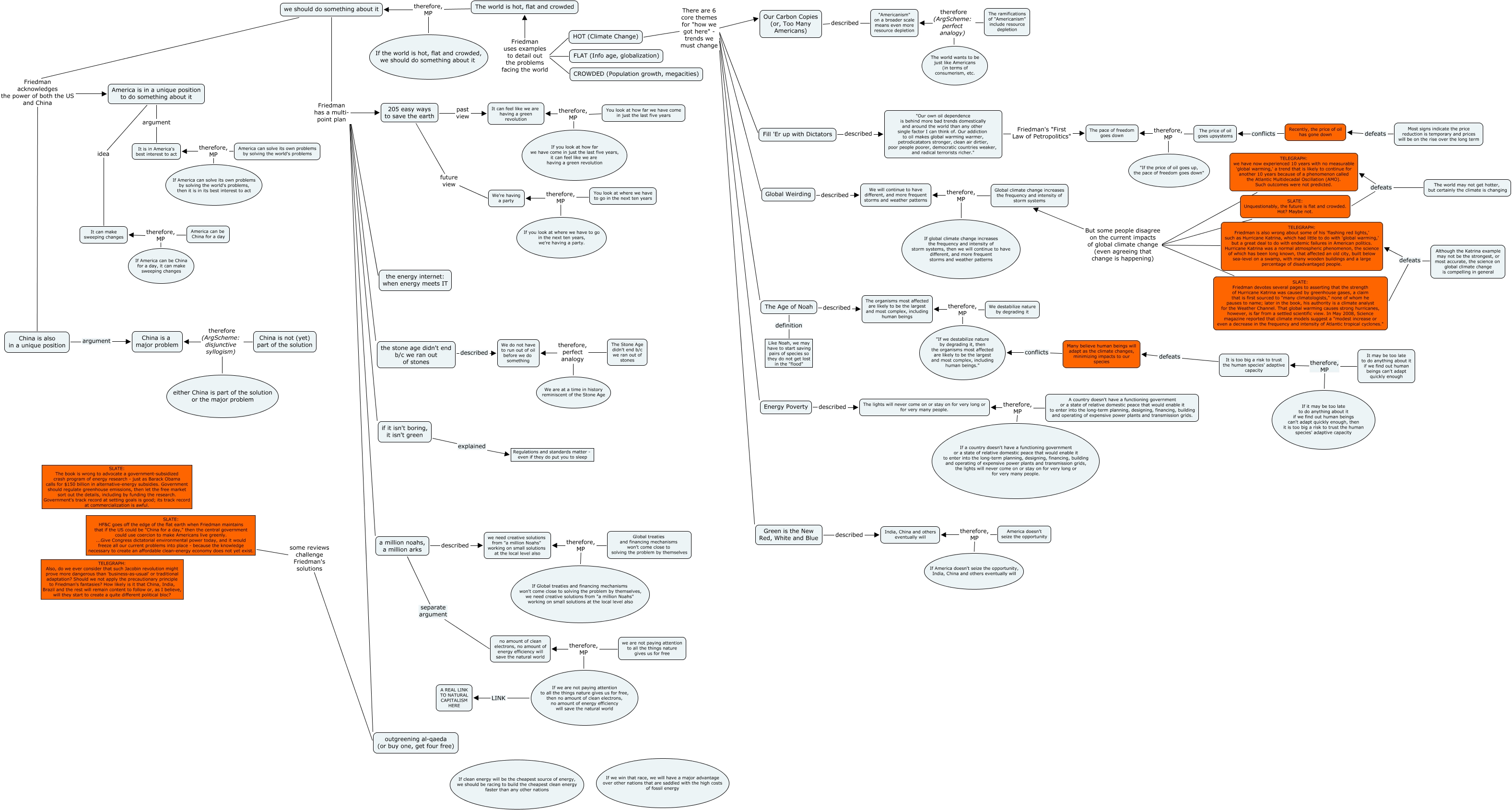 This Concept Map, created with IHMC CmapTools, has information related to: TermProject arg3HFC 111408, 205 easy ways to save the earth past view It can feel like we are having a green revolution, SLATE: HF&C goes off the edge of the flat earth when Friedman maintains that if the US could be "China for a day," then the central government could use coercion to make Americans live greenly. ...Give Congress dictatorial environmental power today, and it would freeze all our current problems into place - because the knowledge necessary to create an affordable clean-energy economy does not yet exist. some reviews challenge Friedman's solutions outgreening al-qaeda (or buy one, get four free), America can be China for a day therefore, MP It can make sweeping changes, "Our own oil dependence is behind more bad trends domestically and around the world than any other single factor I can think of. Our addiction to oil makes global warming warmer, petrodicatators stronger, clean air dirtier, poor people poorer, democratic countries weaker, and radical terrorists richer." Friedman's "First Law of Petropolitics" The pace of freedom goes down, The Age of Noah definition Like Noah, we may have to start saving pairs of species so they do not get lost in the "flood", The price of oil goes upsystems therefore, MP The pace of freedom goes down, HOT (Climate Change) There are 6 core themes for "how we got here" - trends we must change Energy Poverty, If we are not paying attention to all the things nature gives us for free, then no amount of clean electrons, no amount of energy efficiency will save the natural world LINK A REAL LINK TO NATURAL CAPITALISM HERE, we should do something about it Friedman has a multi- point plan 205 easy ways to save the earth, SLATE: Unquestionably, the future is flat and crowded. Hot? Maybe not. But some people disagree on the current impacts of global climate change (even agreeing that change is happening) Global climate change increases the frequency and intensity of storm systems, TELEGRAPH: Friedman is also wrong about some of his 'flashing red lights,' such as Hurricane Katrina, which had little to do with 'global warming,' but a great deal to do with endemic failures in American politics. Hurricane Katrina was a normal atmospheric phenomenon, the science of which has been long known, that affected an old city, built below sea-level on a swamp, with many wooden buildings and a large percentage of disadvantaged people. But some people disagree on the current impacts of global climate change (even agreeing that change is happening) Global climate change increases the frequency and intensity of storm systems, Fill 'Er up with Dictators described "Our own oil dependence is behind more bad trends domestically and around the world than any other single factor I can think of. Our addiction to oil makes global warming warmer, petrodicatators stronger, clean air dirtier, poor people poorer, democratic countries weaker, and radical terrorists richer.", Although the Katrina example may not be the strongest, or most accurate, the science on global climate change is compelling in general defeats SLATE: Friedman devotes several pages to asserting that the strength of Hurricane Katrina was caused by greenhouse gases, a claim that is first sourced to "many climatologists," none of whom he pauses to name; later in the book, his authority is a climate analyst for the Weather Channel. That global warming causes strong hurricanes, however, is far from a settled scientific view. In May 2008, Science magazine reported that climate models suggest a "modest increase or even a decrease in the frequency and intensity of Atlantic tropical cyclones.", we are not paying attention to all the things nature gives us for free therefore, MP no amount of clean electrons, no amount of energy efficiency will save the natural world, we should do something about it Friedman has a multi- point plan the energy internet: when energy meets IT, Green is the New Red, White and Blue described India, China and others eventually will, America is in a unique position to do something about it argument It is in America's best interest to act, If Global treaties and financing mechanisms won't come close to solving the problem by themselves, we need creative solutions from "a million Noahs" working on small solutions at the local level also therefore, MP we need creative solutions from "a million Noahs" working on small solutions at the local level also, HOT (Climate Change) There are 6 core themes for "how we got here" - trends we must change Fill 'Er up with Dictators, America can solve its own problems by solving the world's problems therefore, MP It is in America's best interest to act