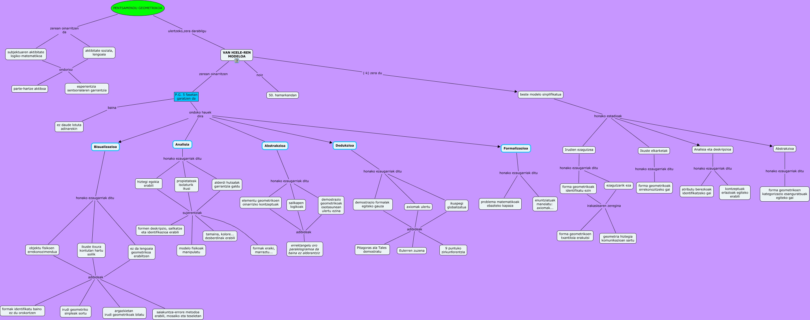 Este Cmap, tiene información relacionada con: Ramirez de Alda_Azurmendi_2, ez da lengoaia geometrikoa erabiltzen adibideak argazkietan irudi geometrikoak bilatu, axiomak ulertu adibideak Eulerren zuzena, demostrazio formalak egiteko gauza adibideak Eulerren zuzena, hiztegi egokia erabili sujerentziak modelo fisikoak manipulatu, Bisualizazioa honako ezaugarriak ditu objektu fisikoen errekonozimendua, Analisia honako ezaugarriak ditu propietateak isolaturik ikusi, ikuste itxura kontutan hartu soilik adibideak saiakuntza-errore metodoa erabili, mosaiko eta teseletan, alderdi hutsalak garrantzia galdu sujerentziak formak eraiki, marraztu..., Analisia eta deskripzioa honako ezaugarriak ditu kontzeptuak erlazioak egiteko erabili, demostrazio formalak egiteko gauza adibideak Pitagoras ala Tales demostratu, forma geometrikoak identifikatu ezin irakaslearen zeregina geometria hiztegia komunikazioan sartu, ez da lengoaia geometrikoa erabiltzen adibideak irudi geometriko sinpleak sortu, alderdi hutsalak garrantzia galdu sujerentziak formen deskripzio, sailkatze eta identifikazioa erabili, Analisia honako ezaugarriak ditu alderdi hutsalak garrantzia galdu, propietateak isolaturik ikusi sujerentziak formen deskripzio, sailkatze eta identifikazioa erabili, beste modelo sinplifikatua honako estadioak Analisia eta deskripzioa, objektu fisikoen errekonozimendua adibideak irudi geometriko sinpleak sortu, Ikuste elkarketak honako ezaugarriak ditu forma geometrikoak errekonozitzeko gai, PENTSAMENDU GEOMETRIKOA ulertzeko,zera darabilgu VAN HIELE-REN MODELOA, Irudien ezagutzea honako ezaugarriak ditu ezagutzarik eza