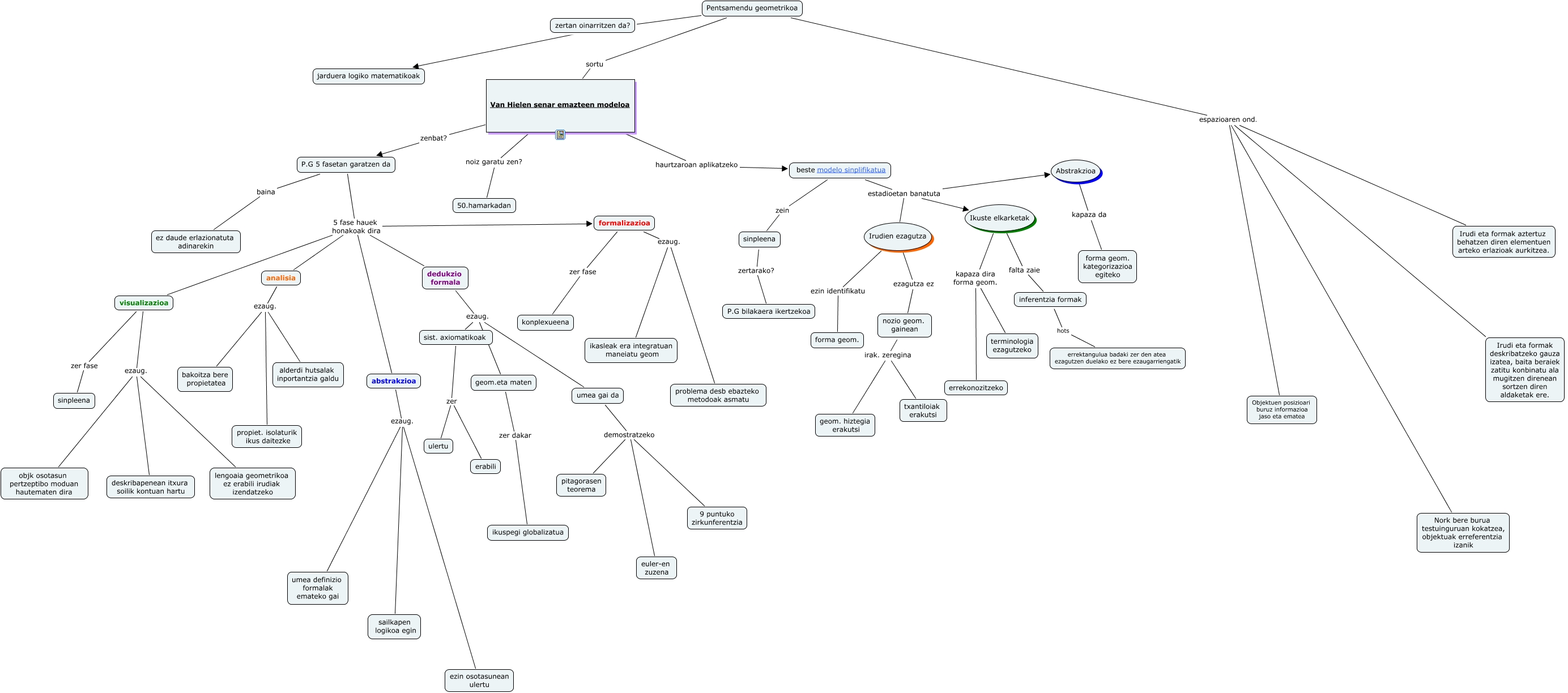 Este Cmap, tiene información relacionada con: prieto_garazi2, Van Hielen senar emazteen modeloa noiz garatu zen? 50.hamarkadan, dedukzio formala ezaug. geom.eta maten, Pentsamendu geometrikoa espazioaren ond. Nork bere burua testuinguruan kokatzea, objektuak erreferentzia izanik, visualizazioa ezaug. objk osotasun pertzeptibo moduan hautematen dira, Ikuste elkarketak kapaza dira forma geom. errekonozitzeko, Irudien ezagutza ezagutza ez nozio geom. gainean, P.G 5 fasetan garatzen da 5 fase hauek honakoak dira analisia, Ikuste elkarketak kapaza dira forma geom. terminologia ezagutzeko, analisia ezaug. bakoitza bere propietatea, visualizazioa zer fase sinpleena, dedukzio formala ezaug. sist. axiomatikoak, analisia ezaug. propiet. isolaturik ikus daitezke, formalizazioa ezaug. problema desb ebazteko metodoak asmatu, abstrakzioa ezaug. umea definizio formalak emateko gai, visualizazioa ezaug. deskribapenean itxura soilik kontuan hartu, analisia ezaug. alderdi hutsalak inportantzia galdu, Pentsamendu geometrikoa ???? jarduera logiko matematikoak, Irudien ezagutza ezin identifikatu forma geom., beste modelo sinplifikatua estadioetan banatuta Irudien ezagutza, Pentsamendu geometrikoa espazioaren ond. Irudi eta formak aztertuz behatzen diren elementuen arteko erlazioak aurkitzea.