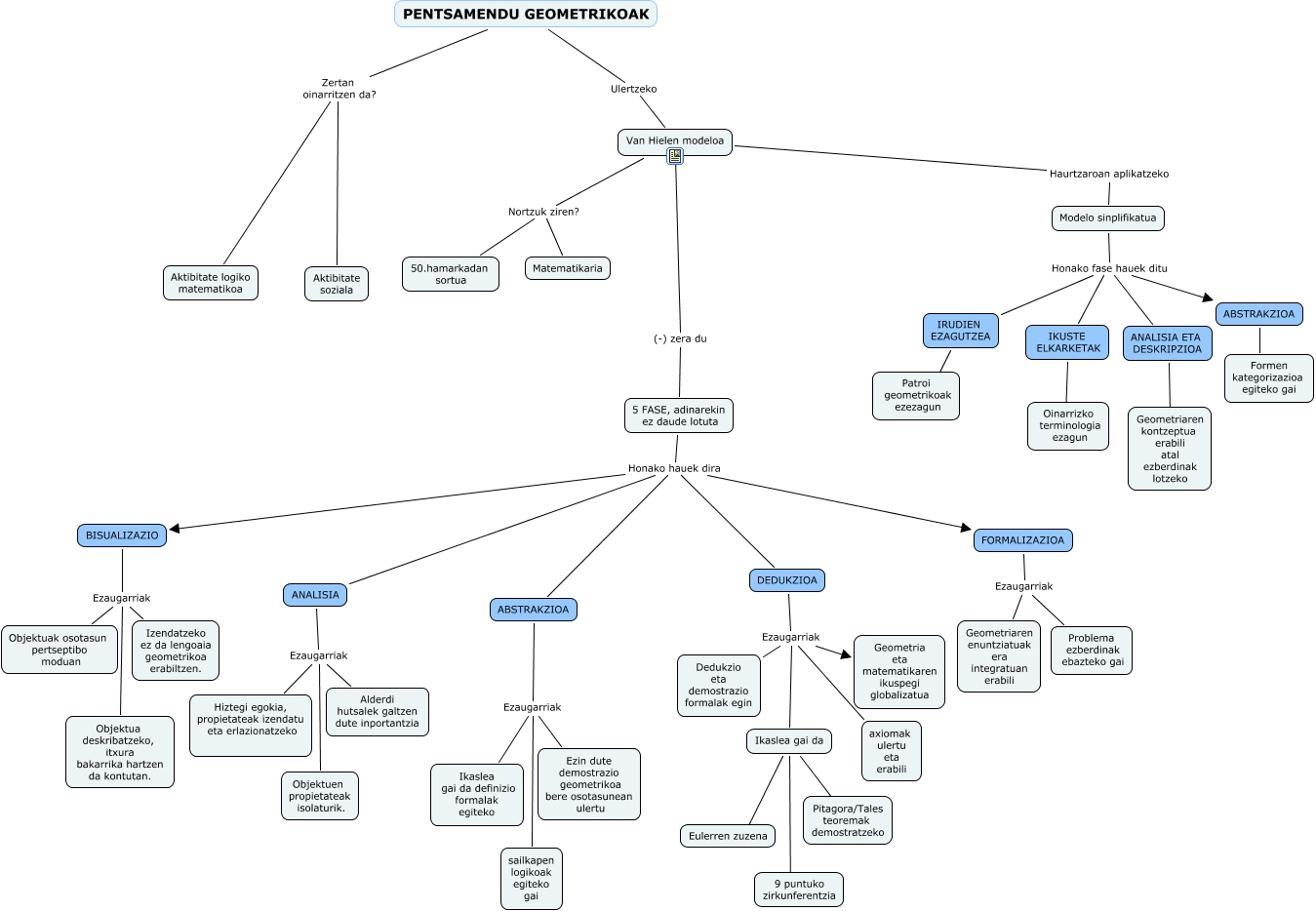 Este Cmap, tiene información relacionada con: Gastelu-urrutia_urien, ANALISIA ETA DESKRIPZIOA ???? Geometriaren kontzeptua erabili atal ezberdinak lotzeko, BISUALIZAZIO Ezaugarriak Objektuak osotasun pertseptibo moduan, ANALISIA Ezaugarriak Hiztegi egokia, propietateak izendatu eta erlazionatzeko, FORMALIZAZIOA Ezaugarriak Geometriaren enuntziatuak era integratuan erabili, DEDUKZIOA Ezaugarriak axiomak ulertu eta erabili, FORMALIZAZIOA Ezaugarriak Problema ezberdinak ebazteko gai, Van Hielen modeloa Nortzuk ziren? Matematikaria, PENTSAMENDU GEOMETRIKOAK Ulertzeko Van Hielen modeloa, 5 FASE, adinarekin ez daude lotuta Honako hauek dira ANALISIA, ANALISIA Ezaugarriak Alderdi hutsalek galtzen dute inportantzia, Ikaslea gai da ???? 9 puntuko zirkunferentzia, BISUALIZAZIO Ezaugarriak Objektua deskribatzeko, itxura bakarrika hartzen da kontutan., PENTSAMENDU GEOMETRIKOAK Zertan oinarritzen da? Aktibitate soziala, ABSTRAKZIOA Ezaugarriak Ezin dute demostrazio geometrikoa bere osotasunean ulertu, IKUSTE ELKARKETAK ???? Oinarrizko terminologia ezagun, 5 FASE, adinarekin ez daude lotuta Honako hauek dira BISUALIZAZIO, 5 FASE, adinarekin ez daude lotuta Honako hauek dira ABSTRAKZIOA, ABSTRAKZIOA Ezaugarriak sailkapen logikoak egiteko gai, Modelo sinplifikatua Honako fase hauek ditu ANALISIA ETA DESKRIPZIOA, Modelo sinplifikatua Honako fase hauek ditu IKUSTE ELKARKETAK