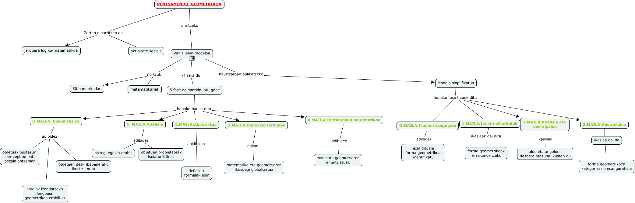 Este Cmap, tiene información relacionada con: Eriz_Urizar_Garazi 2, Van Hielen modeloa nortzuk matematikariak, Modelo sinplifikatua honako fase hauek ditu 3.MAILA:Abstrakzioa, O.MAILA:Irudien ezagutzea adibidez ezin dituzte forma geometrikoak identifikatu, 2.MAILA:Analisia eta deskripzioa ikasleak alde eta angeluen desberdintasuna ikusten du, 5 fase adinarekin lotu gabe honako hauek dira O MAILA: Bisualizazioa, Van Hielen modeloa nortzuk 50.hamarkadan, O MAILA: Bisualizazioa adibidez irudiak izendatzeko lengoaia geometrikoa erabili ez, Van Hielen modeloa (-) zera du 5 fase adinarekin lotu gabe, 3.MAILA:Dedukzio formalak dakar matematika eta geometriaren ikuspegi globalizatua, 2.MAILA:Abstraktua abidibidez definizio formalak egin, 5 fase adinarekin lotu gabe honako hauek dira 4.MAILA:Formaltasun matematikoa, 5 fase adinarekin lotu gabe honako hauek dira 2.MAILA:Abstraktua, O MAILA: Bisualizazioa adibidez objetuen deskribapenerako ikuste-itxura, 1. MAILA:Analisia adibidez objetuen propietateak isolaturik ikusi, 3.MAILA:Abstrakzioa ???? forma geometrikoen kategorizazio esanguratsua, PENTSAMENDU GEOMETRIKOA ulertzeko Van Hielen modeloa, PENTSAMENDU GEOMETRIKOA Zertan oinarritzen da aktibitate soziala, Van Hielen modeloa haurtzaroan aplikatzeko Modelo sinplifikatua, O MAILA: Bisualizazioa adibidez objetuak osotasun pertzeptibo bat bezala antzeman, 4.MAILA:Formaltasun matematikoa adibidez maneiatu geometriaren enuntziatuak