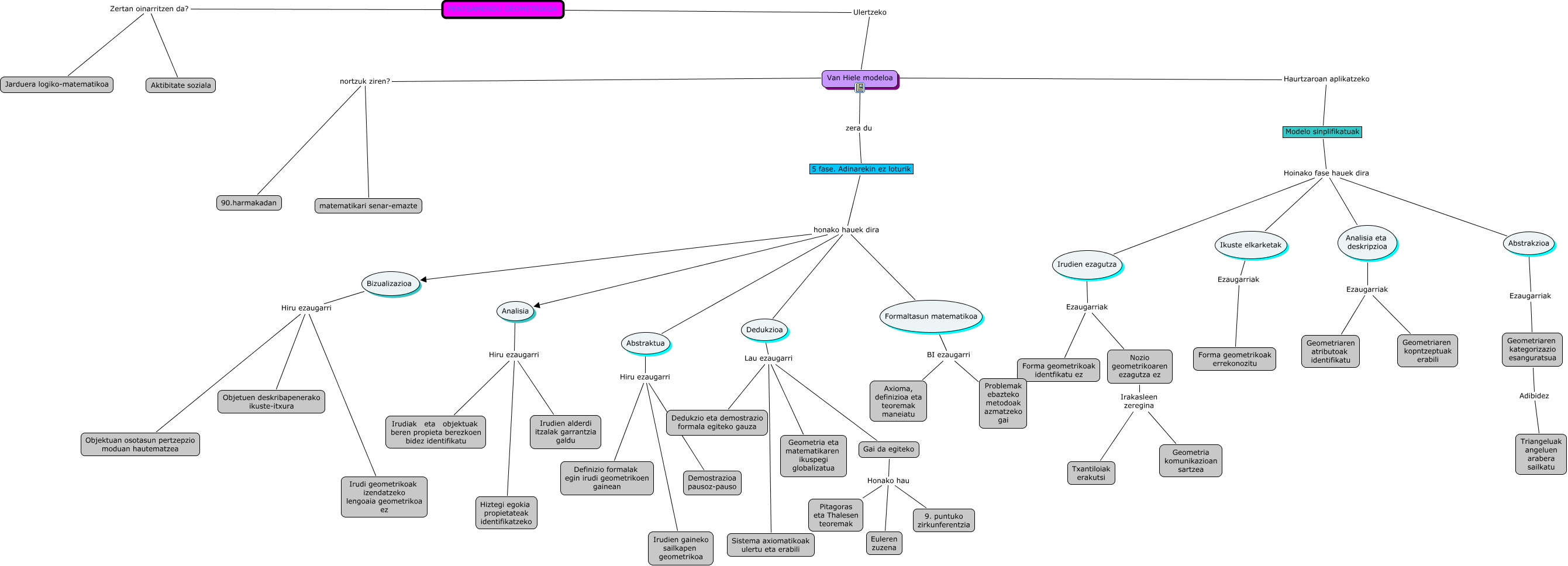 Este Cmap, tiene información relacionada con: Jausoro_Gonzalez de Durana_Aitziber2, Bizualizazioa Hiru ezaugarri Objektuan osotasun pertzepzio moduan hautematzea, 5 fase. Adinarekin ez loturik honako hauek dira Analisia, Gai da egiteko Honako hau Pitagoras eta Thalesen teoremak, Formaltasun matematikoa BI ezaugarri Problemak ebazteko metodoak azmatzeko gai, Bizualizazioa Hiru ezaugarri Objetuen deskribapenerako ikuste-itxura, 5 fase. Adinarekin ez loturik honako hauek dira Bizualizazioa, Formaltasun matematikoa BI ezaugarri Axioma, definizioa eta teoremak maneiatu, Dedukzioa Lau ezaugarri Sistema axiomatikoak ulertu eta erabili, Irudien ezagutza Ezaugarriak Forma geometrikoak identfikatu ez, Analisia Hiru ezaugarri Hiztegi egokia propietateak identifikatzeko, Modelo sinplifikatuak Hoinako fase hauek dira Analisia eta deskripzioa, Analisia Hiru ezaugarri Irudien alderdi itzalak garrantzia galdu, Nozio geometrikoaren ezagutza ez Irakasleen zeregina Geometria komunikazioan sartzea, Abstrakzioa Ezaugarriak Geometriaren kategorizazio esanguratsua, Irudien ezagutza Ezaugarriak Nozio geometrikoaren ezagutza ez, Modelo sinplifikatuak Hoinako fase hauek dira Ikuste elkarketak, Abstraktua Hiru ezaugarri Irudien gaineko sailkapen geometrikoa, Bizualizazioa Hiru ezaugarri Irudi geometrikoak izendatzeko lengoaia geometrikoa ez, PENTSAMENDU GEOMETRIKOA Zertan oinarritzen da? Aktibitate soziala, Abstraktua Hiru ezaugarri Definizio formalak egin irudi geometrikoen gainean