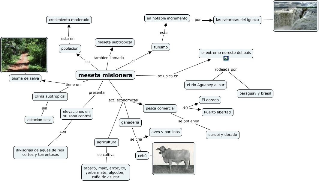 Este mapa conceptual tiene información relacionada a: meseta misionera martin y masi, agricultura se cultiva tabaco, maiz, arroz, te, yerba mate, algodon, caña de azucar, meseta misionera presenta elevaciones en su zona central, pesca comercial se obtienen surubi y dorado, meseta misionera se ubica en el extremo noreste del pais, bioma de selva ???? , meseta misionera act. economicas agricultura, cebú ???? , meseta misionera su poblacion, ganaderia se cria cebú, turismo esta en notable incremento