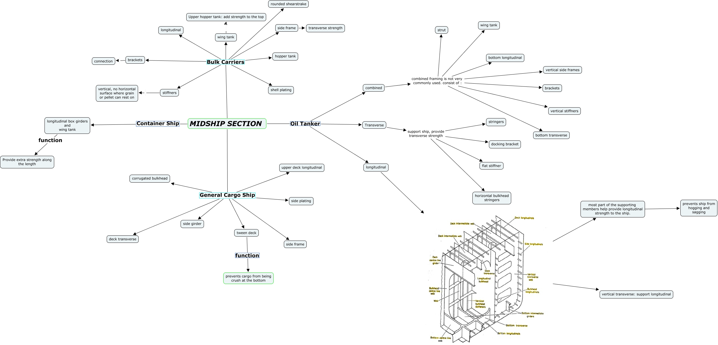 This Concept Map, created with IHMC CmapTools, has information related to: 4 Jace - Midship section, MIDSHIP SECTION Bulk Carriers wing tank, MIDSHIP SECTION Oil Tanker longitudinal, side frame transverse strength, Transverse support ship, provide transverse strength docking bracket, wing tank Upper hopper tank: add strength to the top, combined combined framing is not very commonly used. consist of : vertical stiffners, tween deck function prevents cargo from being crush at the bottom, combined combined framing is not very commonly used. consist of : vertical side frames, MIDSHIP SECTION General Cargo Ship upper deck longitudinal, longitudinal most part of the supporting members help provide longitudinal strength to the ship., MIDSHIP SECTION Bulk Carriers shell plating, MIDSHIP SECTION General Cargo Ship tween deck, combined combined framing is not very commonly used. consist of : wing tank, MIDSHIP SECTION Bulk Carriers brackets, MIDSHIP SECTION Bulk Carriers hopper tank, MIDSHIP SECTION Bulk Carriers side frame, most part of the supporting members help provide longitudinal strength to the ship. ???? prevents ship from hogging and sagging, longitudinal vertical transverse: support longitudinal, MIDSHIP SECTION Bulk Carriers rounded shearstrake, MIDSHIP SECTION Oil Tanker Transverse