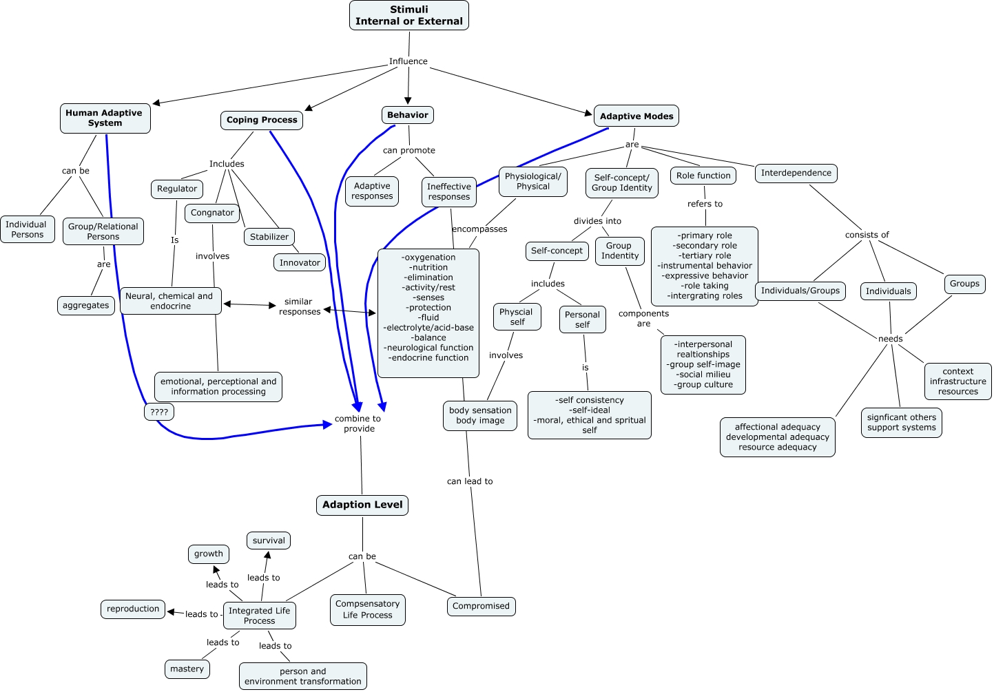 This Concept Map, created with IHMC CmapTools, has information related to: Roy, Stimuli Internal or External Influence Coping Process, Behavior can promote Ineffective responses, Interdependence consists of Groups, Individuals needs context infrastructure resources, Groups needs context infrastructure resources, Adaption Level can be Integrated Life Process, Individuals/Groups needs context infrastructure resources, Stimuli Internal or External Influence Behavior, Adaptive Modes combine to provide Adaption Level, Adaptive Modes are Interdependence, Role function refers to -primary role -secondary role -tertiary role -instrumental behavior -expressive behavior -role taking -intergrating roles, Regulator Is Neural, chemical and endocrine, Interdependence consists of Individuals, Interdependence consists of Individuals/Groups, Behavior can promote Adaptive responses, Coping Process Includes Regulator, Integrated Life Process leads to person and environment transformation, Behavior combine to provide Adaption Level, Adaptive Modes are Role function, Coping Process Includes Congnator