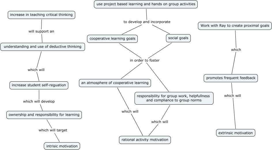 This Concept Map, created with IHMC CmapTools, has information related to: P. Grissett-Motivation for Ray, social goals in order to foster an atmosphere of cooperative learning, increase in teaching critical thinking will support an understanding and use of deductive thinking, ownership and responsibility for learning which will target intrisic motivation, Work with Ray to create proximal goals which promotes frequent feedback, understanding and use of deductive thinking which will increase student self-reguation, promotes frequent feedback which will extrinsic motivation, responsibility for group work, helpfullness and compliance to group norms which will rational activity motivation, use project based learning and hands on group activities to develop and incorporate cooperative learning goals, increase student self-reguation which will develop ownership and responsibility for learning, an atmosphere of cooperative learning which will rational activity motivation, use project based learning and hands on group activities to develop and incorporate social goals, cooperative learning goals in order to foster responsibility for group work, helpfullness and compliance to group norms, cooperative learning goals in order to foster an atmosphere of cooperative learning, social goals in order to foster responsibility for group work, helpfullness and compliance to group norms