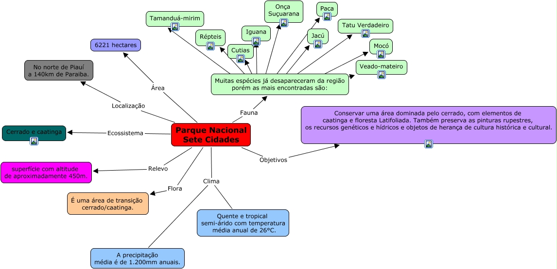 Sem título, Muitas espécies já desapareceram da região porém as mais encontradas são: ???? Cutias, Muitas espécies já desapareceram da região porém as mais encontradas são: ???? Paca, Parque Nacional Sete Cidades Ecossistema Cerrado e caatinga, Muitas espécies já desapareceram da região porém as mais encontradas são: ???? Tamanduá-mirim, Parque Nacional Sete Cidades Relevo superfície com altitude de aproximadamente 450m., Parque Nacional Sete Cidades Flora É uma área de transição cerrado/caatinga., Muitas espécies já desapareceram da região porém as mais encontradas são: ???? Veado-mateiro, Parque Nacional Sete Cidades Área 6221 hectares, Parque Nacional Sete Cidades Objetivos Conservar uma área dominada pelo cerrado, com elementos de caatinga e floresta Latifoliada. Também preserva as pinturas rupestres, os recursos genéticos e hídricos e objetos de herança de cultura histórica e cultural., Muitas espécies já desapareceram da região porém as mais encontradas são: ???? Jacú