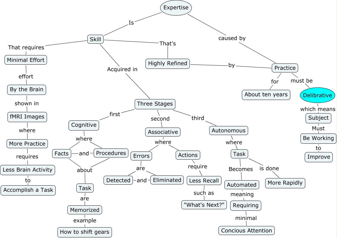 This Concept Map, created with IHMC CmapTools, has information related to: Expertise First, Task is done More Rapidly, Actions require Less Recall, Practice must be Delibrative, Facts about Task, Cognitive where Procedures, Expertise caused by Practice, More Practice requires Less Brain Activity, Skill That's Highly Refined, Less Recall such as "What's Next?", Three Stages first Cognitive, Skill Acquired in Three Stages, Errors are Detected, Task Becomes Automated, Associative where Errors, Detected and Eliminated, Practice for About ten years, Task are Memorized, Three Stages third Autonomous, Associative where Actions, Requiring minimal Concious Attention