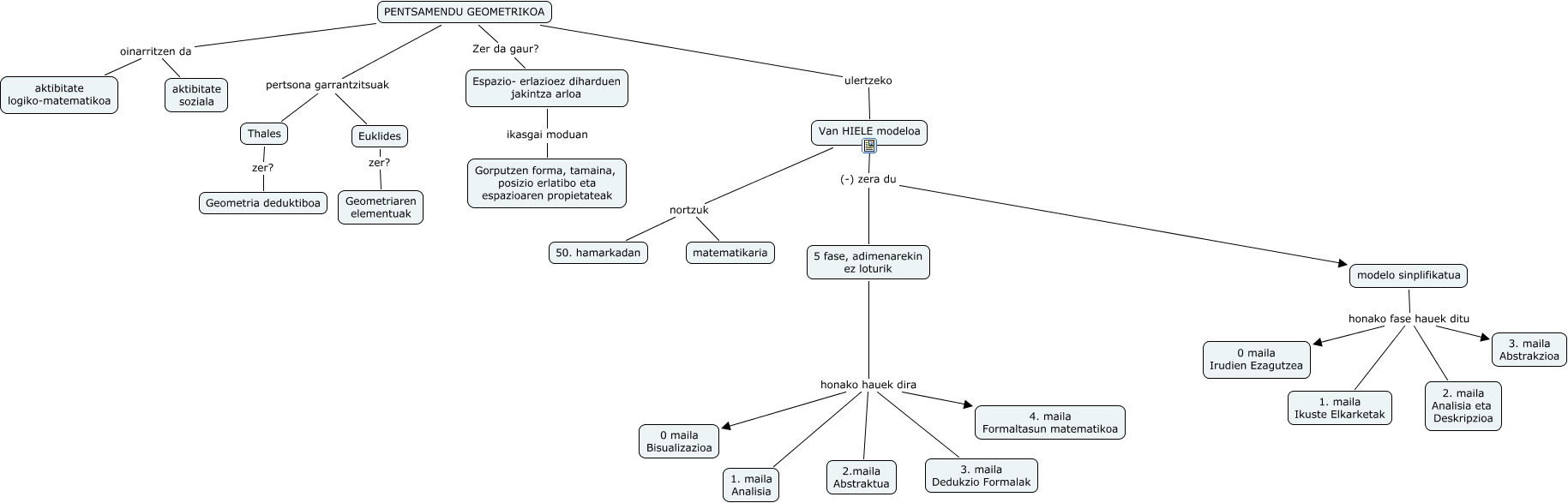 Este Cmap, tiene información relacionada con: Argintxona_Atxa_Jone 2, 5 fase, adimenarekin ez loturik honako hauek dira 4. maila Formaltasun matematikoa, 5 fase, adimenarekin ez loturik honako hauek dira 3. maila Dedukzio Formalak, PENTSAMENDU GEOMETRIKOA pertsona garrantzitsuak Euklides, PENTSAMENDU GEOMETRIKOA oinarritzen da aktibitate logiko-matematikoa, 5 fase, adimenarekin ez loturik honako hauek dira 1. maila Analisia, 5 fase, adimenarekin ez loturik honako hauek dira 0 maila Bisualizazioa, modelo sinplifikatua honako fase hauek ditu 2. maila Analisia eta Deskripzioa, PENTSAMENDU GEOMETRIKOA Zer da gaur? Espazio- erlazioez diharduen jakintza arloa, PENTSAMENDU GEOMETRIKOA pertsona garrantzitsuak Thales, PENTSAMENDU GEOMETRIKOA ulertzeko Van HIELE modeloa, Euklides zer? Geometriaren elementuak, Thales zer? Geometria deduktiboa, modelo sinplifikatua honako fase hauek ditu 0 maila Irudien Ezagutzea, Van HIELE modeloa (-) zera du 5 fase, adimenarekin ez loturik, PENTSAMENDU GEOMETRIKOA oinarritzen da aktibitate soziala, Van HIELE modeloa nortzuk matematikaria, 5 fase, adimenarekin ez loturik honako hauek dira 2.maila Abstraktua, Espazio- erlazioez diharduen jakintza arloa ikasgai moduan Gorputzen forma, tamaina, posizio erlatibo eta espazioaren propietateak, modelo sinplifikatua honako fase hauek ditu 3. maila Abstrakzioa, Van HIELE modeloa nortzuk 50. hamarkadan