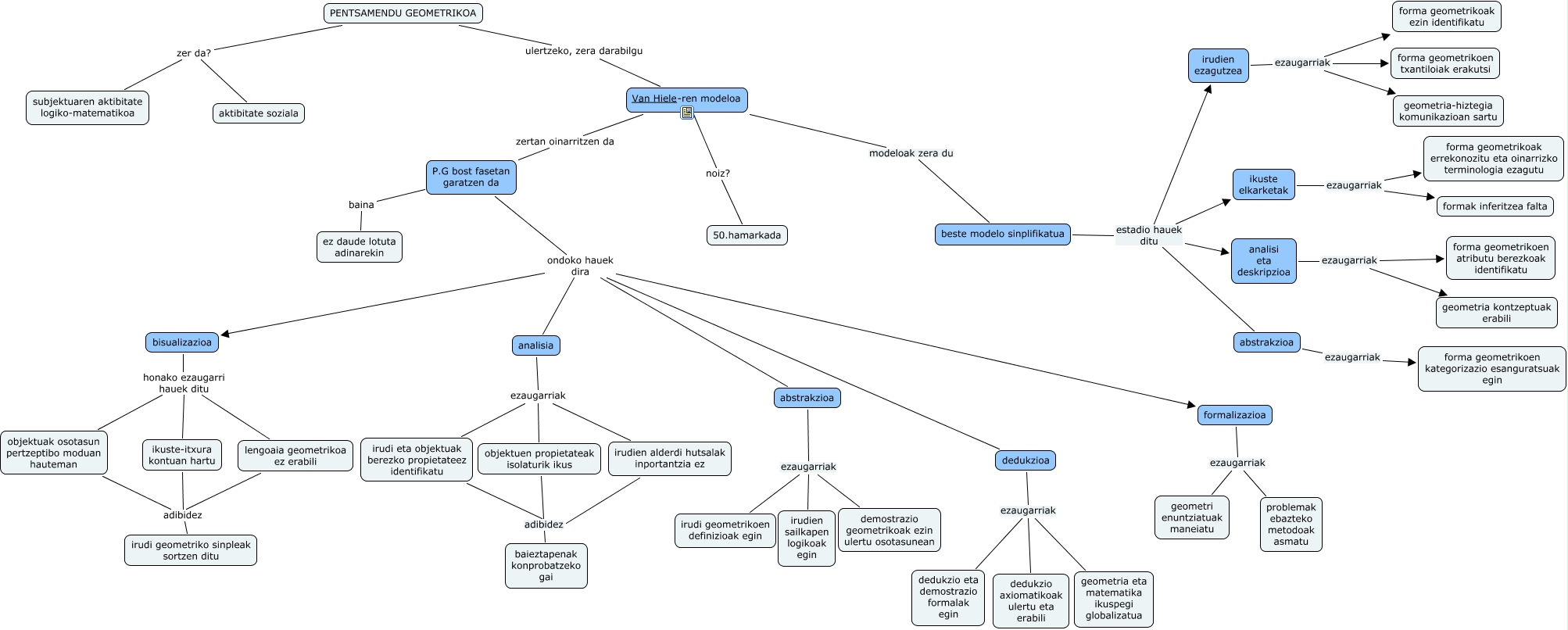 Este Cmap, tiene información relacionada con: Llanos_González de Durana_Estibaliz_2.1, ikuste elkarketak ezaugarriak formak inferitzea falta, abstrakzioa ezaugarriak forma geometrikoen kategorizazio esanguratsuak egin, PENTSAMENDU GEOMETRIKOA ulertzeko, zera darabilgu Van Hiele-ren modeloa, ikuste-itxura kontuan hartu adibidez irudi geometriko sinpleak sortzen ditu, analisi eta deskripzioa ezaugarriak forma geometrikoen atributu berezkoak identifikatu, beste modelo sinplifikatua estadio hauek ditu analisi eta deskripzioa, objektuen propietateak isolaturik ikus adibidez baieztapenak konprobatzeko gai, beste modelo sinplifikatua estadio hauek ditu irudien ezagutzea, dedukzioa ezaugarriak dedukzio eta demostrazio formalak egin, irudien ezagutzea ezaugarriak forma geometrikoen txantiloiak erakutsi, ikuste elkarketak ezaugarriak forma geometrikoak errekonozitu eta oinarrizko terminologia ezagutu, formalizazioa ezaugarriak geometri enuntziatuak maneiatu, bisualizazioa honako ezaugarri hauek ditu ikuste-itxura kontuan hartu, Van Hiele-ren modeloa zertan oinarritzen da P.G bost fasetan garatzen da, bisualizazioa honako ezaugarri hauek ditu lengoaia geometrikoa ez erabili, P.G bost fasetan garatzen da ondoko hauek dira dedukzioa, P.G bost fasetan garatzen da ondoko hauek dira formalizazioa, abstrakzioa ezaugarriak irudien sailkapen logikoak egin, analisia ezaugarriak irudien alderdi hutsalak inportantzia ez, lengoaia geometrikoa ez erabili adibidez irudi geometriko sinpleak sortzen ditu