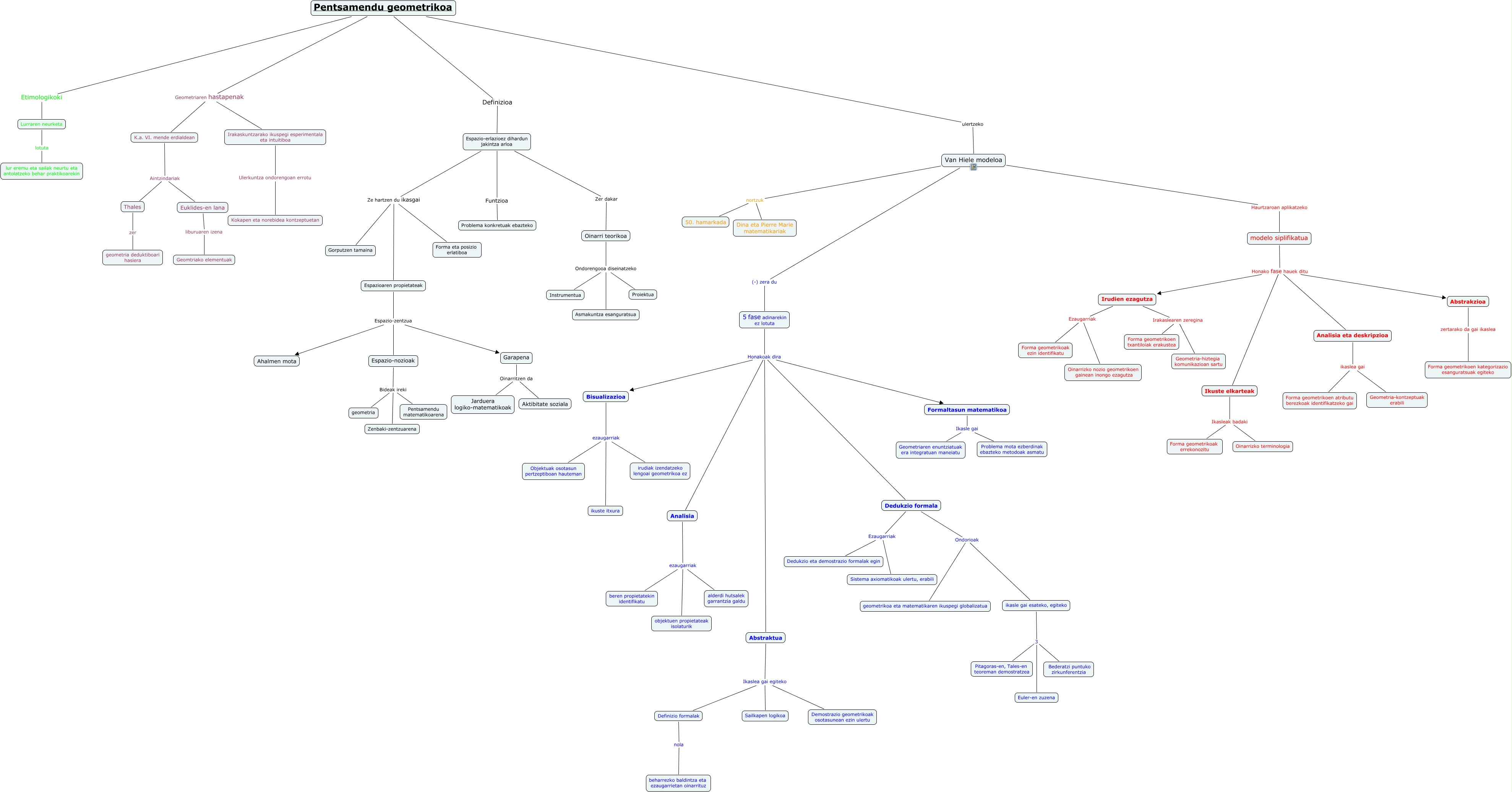 Este Cmap, tiene información relacionada con: Mapa kontzeptuala2, Dedukzio formala Ondorioak geometrikoa eta matematikaren ikuspegi globalizatua, Pentsamendu geometrikoa Definizioa Espazio-erlazioez dihardun jakintza arloa, Espazio-nozioak Bideak ireki Pentsamendu matematikoarena, Irakaskuntzarako ikuspegi esperimentala eta intuitiboa Ulerkuntza ondorengoan errotu Kokapen eta norebidea kontzeptuetan, 5 fase adinarekin ez lotuta Honakoak dira Dedukzio formala, Analisia ezaugarriak beren propietatekin identifikatu, K.a. VI. mende erdialdean Aintzindariak Euklides-en lana, Bisualizazioa ezaugarriak irudiak izendatzeko lengoai geometrikoa ez, ikasle gai esateko, egiteko 3 Euler-en zuzena, Irudien ezagutza Irakaslearen zeregina Forma geometrikoen txantiloiak erakustea, Formaltasun matematikoa Ikasle gai Geometriaren enuntziatuak era integratuan maneiatu, Bisualizazioa ezaugarriak ikuste itxura, Espazio-erlazioez dihardun jakintza arloa Ze hartzen du ikasgai Forma eta posizio erlatiboa, Analisia ezaugarriak objektuen propietateak isolaturik, Ikuste elkarteak Ikasleak badaki Forma geometrikoak errekonozitu, Espazio-nozioak Bideak ireki geometria, Pentsamendu geometrikoa Geometriaren hastapenak Irakaskuntzarako ikuspegi esperimentala eta intuitiboa, Garapena Oinarritzen da Aktibitate soziala, 5 fase adinarekin ez lotuta Honakoak dira Abstraktua, Dedukzio formala Ondorioak ikasle gai esateko, egiteko