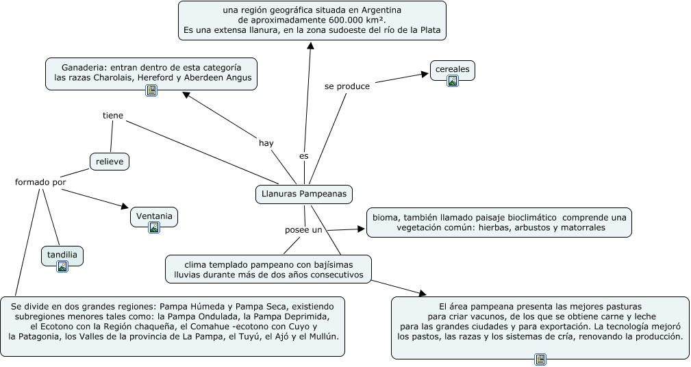 Este mapa conceptual tiene información relacionada a: llanura pampeana faty, Llanuras Pampeanas tiene relieve, Llanuras Pampeanas posee un clima templado pampeano con bajísimas lluvias durante más de dos años consecutivos, Llanuras Pampeanas hay Ganaderia: entran dentro de esta categoría las razas Charolais, Hereford y Aberdeen Angus, Llanuras Pampeanas es una región geográfica situada en Argentina de aproximadamente 600.000 km². Es una extensa llanura, en la zona sudoeste del río de la Plata, Llanuras Pampeanas posee un bioma, también llamado paisaje bioclimático comprende una vegetación común: hierbas, arbustos y matorrales, relieve formado por tandilia, relieve formado por Ventania, Llanuras Pampeanas ???? El área pampeana presenta las mejores pasturas para criar vacunos, de los que se obtiene carne y leche para las grandes ciudades y para exportación. La tecnología mejoró los pastos, las razas y los sistemas de cría, renovando la producción., relieve formado por Se divide en dos grandes regiones: Pampa Húmeda y Pampa Seca, existiendo subregiones menores tales como: la Pampa Ondulada, la Pampa Deprimida, el Ecotono con la Región chaqueña, el Comahue -ecotono con Cuyo y la Patagonia, los Valles de la provincia de La Pampa, el Tuyú, el Ajó y el Mullún., Llanuras Pampeanas se produce cereales