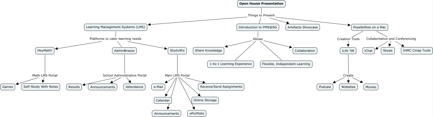 This Concept Map, created with IHMC CmapTools, has information related to: Copy of FMS Presentation, Possibilities on a Mac Collabortative and Conferencing IHMC Cmap Tools, StudyWiz Main LMS Portal Receive/Send Assignments, Open House Presentation Things to Present Artefacts Showcase, StudyWiz Main LMS Portal Announcements, Introduction to FMS@SG Allows Flexible, Independent Learning, Possibilities on a Mac Collabortative and Conferencing iChat, Open House Presentation Things to Present Possibilities on a Mac, Learning Management Systems (LMS) Platforms to cater learning needs StudyWiz, Introduction to FMS@SG Allows Share Knowledge, Introduction to FMS@SG Allows 1-to-1 Learning Experience, Possibilities on a Mac Collabortative and Conferencing Skype, iLife '08 Create Movies, StudyWiz Main LMS Portal Online Storage, AdminBreeze School Administrative Portal Announcements, HeyMath! Math LMS Portal Self-Study With Notes, HeyMath! Math LMS Portal Games, AdminBreeze School Administrative Portal Attendance, Possibilities on a Mac Creation Tools iLife '08, Learning Management Systems (LMS) Platforms to cater learning needs AdminBreeze, StudyWiz Main LMS Portal Calendar