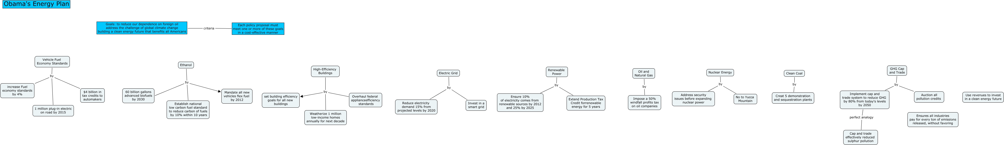 This Concept Map, created with IHMC CmapTools, has information related to: Obama_energy_plan, Clean Coal by Creat 5 demonstration and sequestration plants, Nuclear Energy by No to Yucca Mountain, Renewable Power by Ensure 10% of electricity comes from renewable sources by 2012 and 25% by 2025, GHG Cap and Trade by Implement cap and trade system to reduce GHG by 80% from today's levels by 2050, High-Efficiency Buildings by Overhaul federal applianceefficiency standards, Ethanol by 60 billion gallons advanced biofuels by 2030, Ethanol by Establish national low carbon fuel standard to reduce carbon of fuels by 10% within 10 years, High-Efficiency Buildings by Weatherize 1 million low-income homes annually for next decade, Renewable Power by Extend Production Tax Credit forrenewable energy for 5 years, Nuclear Energy by Address security issues before expanding nuclear power, Electric Grid by Invest in a smart grid, Goals: to reduce our dependence on foreign oil address the challenge of global climate change building a clean energy future that benefits all Americans criteria Each policy proposal must meet one or more of these goals in a cost-effective manner, Oil and Natural Gas by Impose a 50% windfall profits tax on oil companies, GHG Cap and Trade by Auction all pollution credits, Vehicle Fuel Economy Standards by 1 million plug-in electric on road by 2015, High-Efficiency Buildings by set building efficiency goals for all new buildings, Electric Grid by Reduce electricity demand 15% from projected levels by 2020, Vehicle Fuel Economy Standards by $4 billion in tax credits to automakers, Vehicle Fuel Economy Standards by increase Fuel economy standards by 4%, Cap and trade effectively reduced sulphur pollution perfect analogy Implement cap and trade system to reduce GHG by 80% from today's levels by 2050