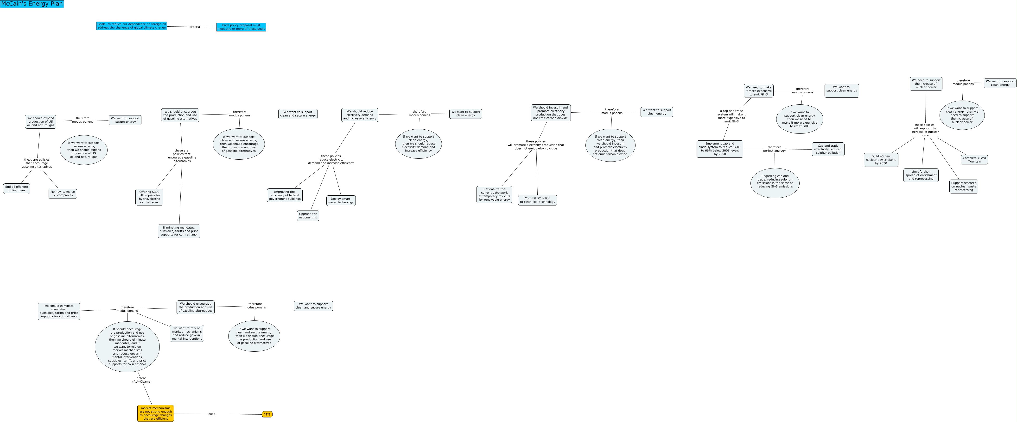 This Concept Map, created with IHMC CmapTools, has information related to: McCain_energy_planv2, we want to rely on market mechanisms and reduce govern- mental interventions therefore modus ponens we should eliminate mandates, subsidies, tariffs and price supports for corn ethanol, We want to support clean and secure energy therefore modus ponens We should encourage the production and use of gasoline alternatives, We should reduce electricity demand and increase efficiency these policies reduce electricity demand and increase efficiency Deploy smart meter technology, If we want to support clean energy, then we should reduce electricity demand and increase efficiency therefore modus ponens We should reduce electricity demand and increase efficiency, If we want to support secure energy, then we should expand production of US oil and natural gas therefore modus ponens We should expand production of US oil and natural gas, We should encourage the production and use of gasoline alternatives therefore modus ponens we should eliminate mandates, subsidies, tariffs and price supports for corn ethanol, If we want to support clean and secure energy, then we should encourage the production and use of gasoline alternatives therefore modus ponens We should encourage the production and use of gasoline alternatives, We need to support the increase of nuclear power these policies will support the increase of nuclear power Limit further spread of enrichment and reprocessing, Cap and trade effectively reduced sulphur pollution therefore perfect analogy Implement cap and trade system to reduce GHG to 66% below 2005 levels by 2050, We want to support clean energy therefore modus ponens We should reduce electricity demand and increase efficiency, We should encourage the production and use of gasoline alternatives these are policies that encourage gasoline alternatives Eliminating mandates, subsidies, tariffs and price supports for corn ethanol, If we want to support clean and secure energy, then we should encourage the production and use of gasoline alternatives therefore modus ponens We should encourage the production and use of gasoline alternatives, We want to support clean energy therefore modus ponens We need to support the increase of nuclear power, If should encourage the production and use of gasoline alternatives, then we should eliminate mandates, and if we want to rely on market mechanisms and reduce govern- mental interventions, subsidies, tariffs and price supports for corn ethanol therefore modus ponens we should eliminate mandates, subsidies, tariffs and price supports for corn ethanol, If we want to support clean energy, then we need to support the increase of nuclear power therefore modus ponens We need to support the increase of nuclear power, Regarding cap and trade, reducing sulphur emissions is the same as reducing GHG emissions therefore perfect analogy Implement cap and trade system to reduce GHG to 66% below 2005 levels by 2050, We want to support clean energy therefore modus ponens If we want to support clean energy, then we need to support the increase of nuclear power, market mechanisms are not strong enough to encourage changes that are efficient defeat (AU=Obama If should encourage the production and use of gasoline alternatives, then we should eliminate mandates, and if we want to rely on market mechanisms and reduce govern- mental interventions, subsidies, tariffs and price supports for corn ethanol, We want to support clean energy therefore modus ponens We need to make it more expensive to emit GHG, We should encourage the production and use of gasoline alternatives these are policies that encourage gasoline alternatives Offering $300 million prize for hybrid/electric car batteries